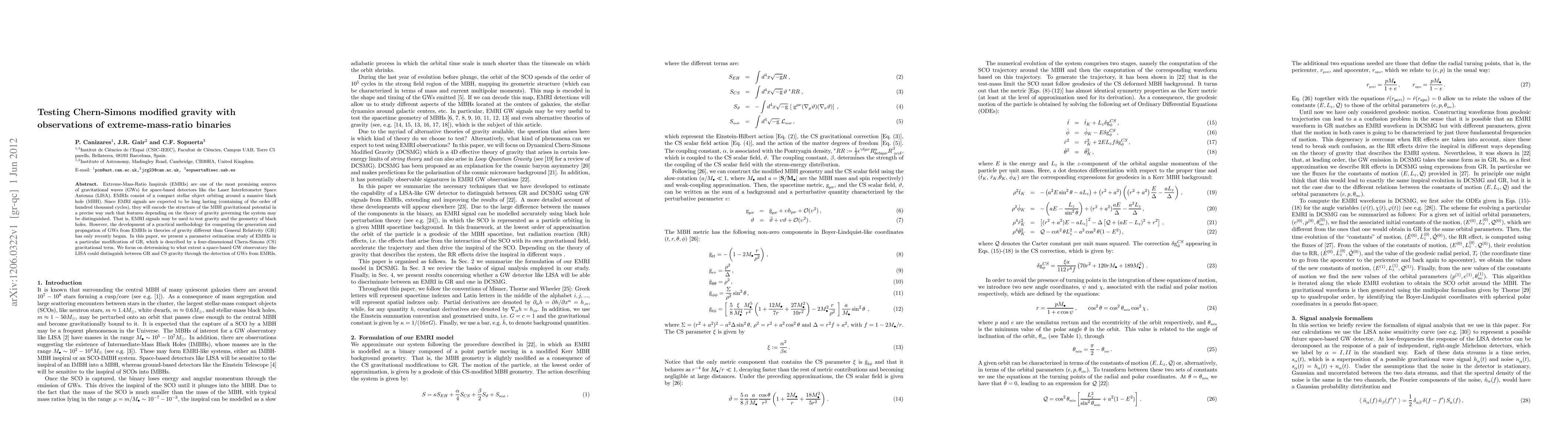 This paper investigates the use of Extreme-Mass-Ratio Inspirals (EMRIs) to test Chern-Simons modified gravity against General Relativity, focusing on the potential of space-based gravitational wave detectors like LISA to distinguish between these theories through EMRI signals.