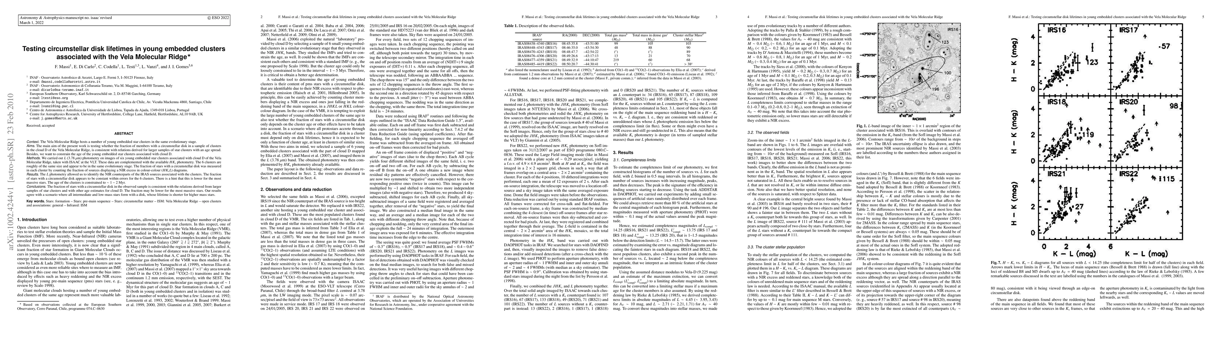This paper investigates the circumstellar disk lifetimes in young embedded clusters within the Vela Molecular Ridge's cloud D using L-band and HKs photometry. The study finds a consistent fraction of stars with circumstellar disks across six clusters, suggesting shorter disk lifetimes for more massive stars, and estimates the clusters' age to be around 1-2 Myr.