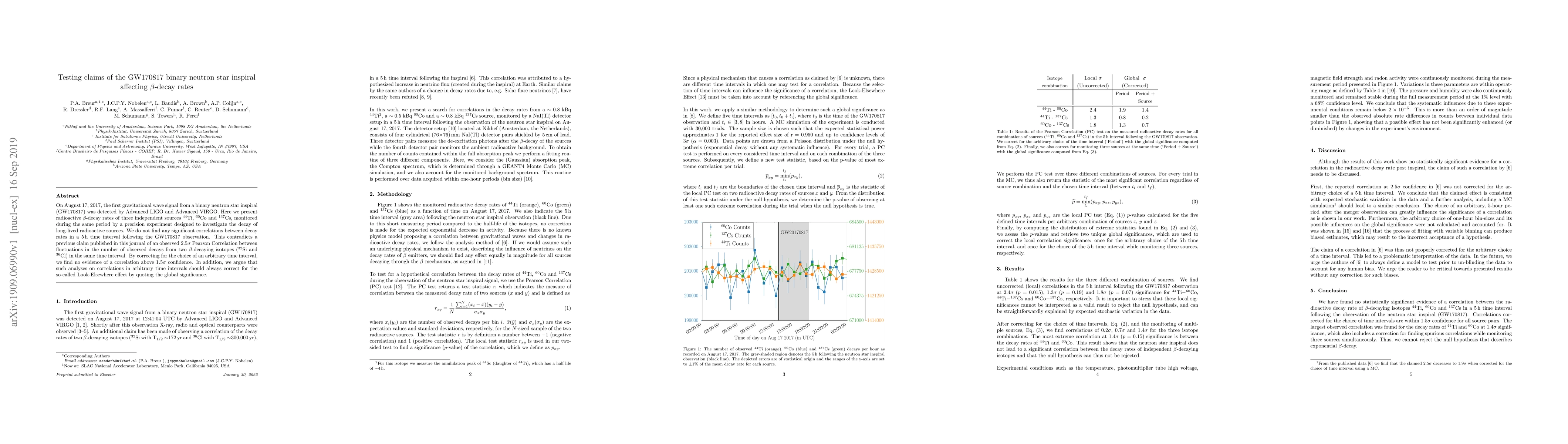 On August 17, 2017, the first gravitational wave signal from a binary neutron star inspiral (GW170817) was detected by Advanced LIGO and Advanced VIRGO. Here we present radioactive $\beta$-decay rates of three independent sources $^{44}$Ti, $^{60}$Co and $^{137}$Cs, monitored during the same period by a precision experiment designed to investigate the decay of long-lived radioactive sources. We do not find any significant correlations between decay rates in a 5\,h time interval following the GW170817 observation. This contradicts a previous claim published in this journal of an observed 2.5$\sigma$ Pearson Correlation between fluctuations in the number of observed decays from two $\beta$-decaying isotopes ($^{32}$Si and $^{36}$Cl) in the same time interval. By correcting for the choice of an arbitrary time interval, we find no evidence of a correlation above 1.5$\sigma$ confidence. In addition, we argue that such analyses on correlations in arbitrary time intervals should always correct for the so-called Look-Elsewhere effect by quoting the global significance.