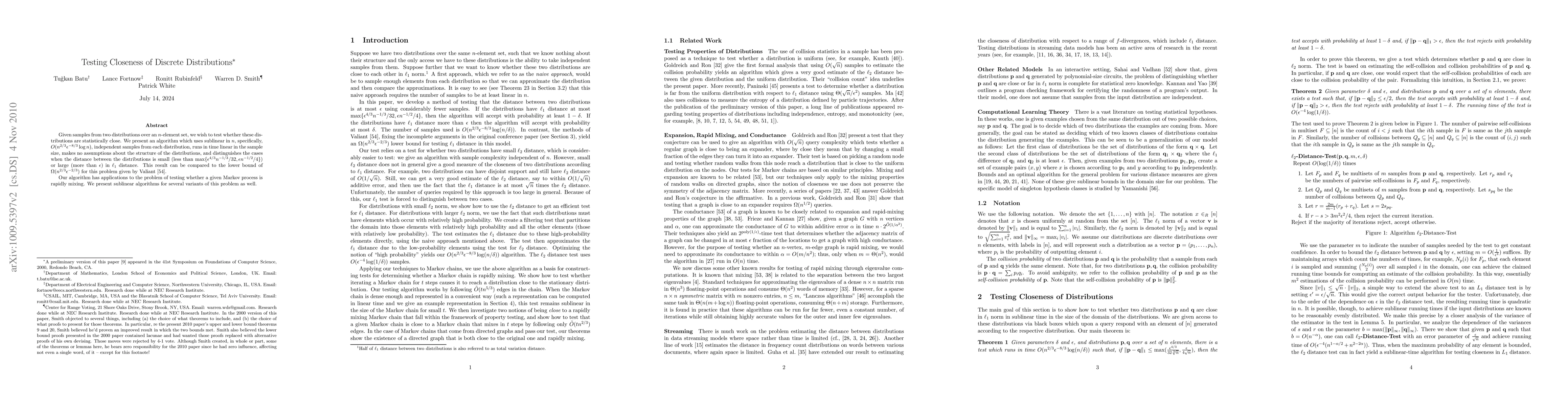 Researchers developed an algorithm to test if two discrete distributions are statistically close, achieving sublinear time complexity $O(n^{2/3} heta^{-8/3}eta n)$ with applications to testing Markov processes.