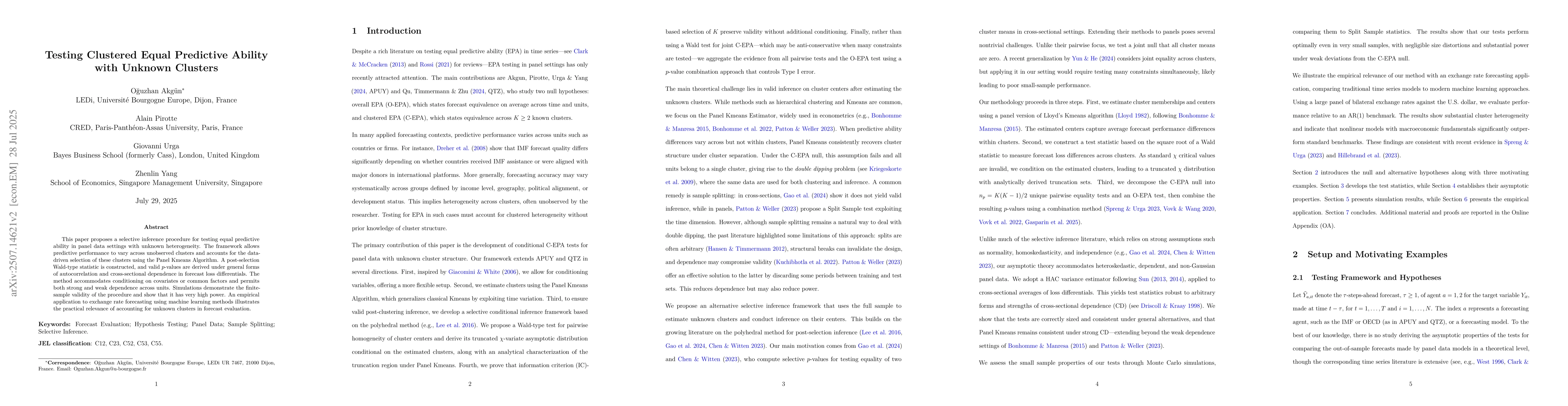 We develop new tests of clustered equal predictive ability (C-EPA) in panels where the clusters are unknown and estimated by a Panel Kmeans algorithm. This algorithm differs from the standard Kmeans algorithm by employing the time series variation of the panel rather than relying merely on time averages of observations. To address the challenge of testing hypotheses that depend on data-driven cluster estimates, we adopt a selective conditional inference framework. Specifically, we derive a Wald-type test statistic for pairwise equality and show that the limiting distribution of its square root conditional on the estimated cluster structure is that of a truncated $\chi$ random variable. We characterize the associated truncation set as a polyhedron in the data space. As a test of the C-EPA hypothesis, we propose a $p$-value combination method which aggregates the evidence against the pairwise equality and overall EPA null hypotheses. In addition, we prove that using an information criterion to select the unknown number of clusters under the alternative hypothesis prior to testing does not require further conditioning to obtain a valid test. Monte Carlo simulations confirm the excellent finite sample performance of the proposed tests. An empirical application to forecasting exchange rates using traditional time series models as well as machine learning methods illustrates the practical importance of our procedure.
