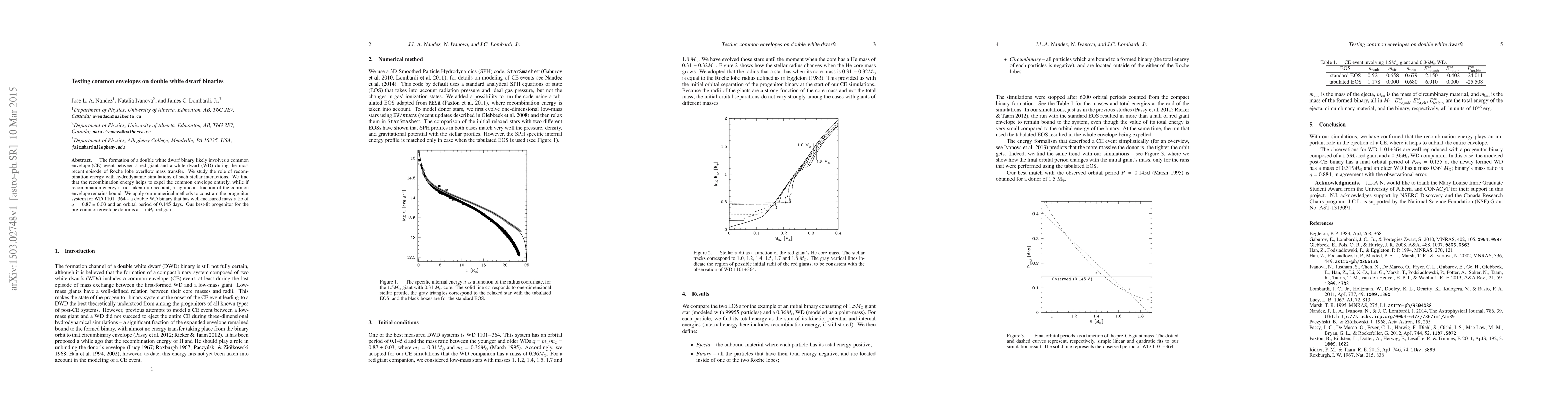 The formation of a double white dwarf binary likely involves a common envelope (CE) event between a red giant and a white dwarf (WD) during the most recent episode of Roche lobe overflow mass transfer. We study the role of recombination energy with hydrodynamic simulations of such stellar interactions. We find that the recombination energy helps to expel the common envelope entirely, while if recombination energy is not taken into account, a significant fraction of the common envelope remains bound. We apply our numerical methods to constrain the progenitor system for WD 1101+364 -- a double WD binary that has well-measured mass ratio of $q=0.87\pm0.03$ and an orbital period of 0.145 days. Our best-fit progenitor for the pre-common envelope donor is a 1.5 $M_\odot$ red giant.