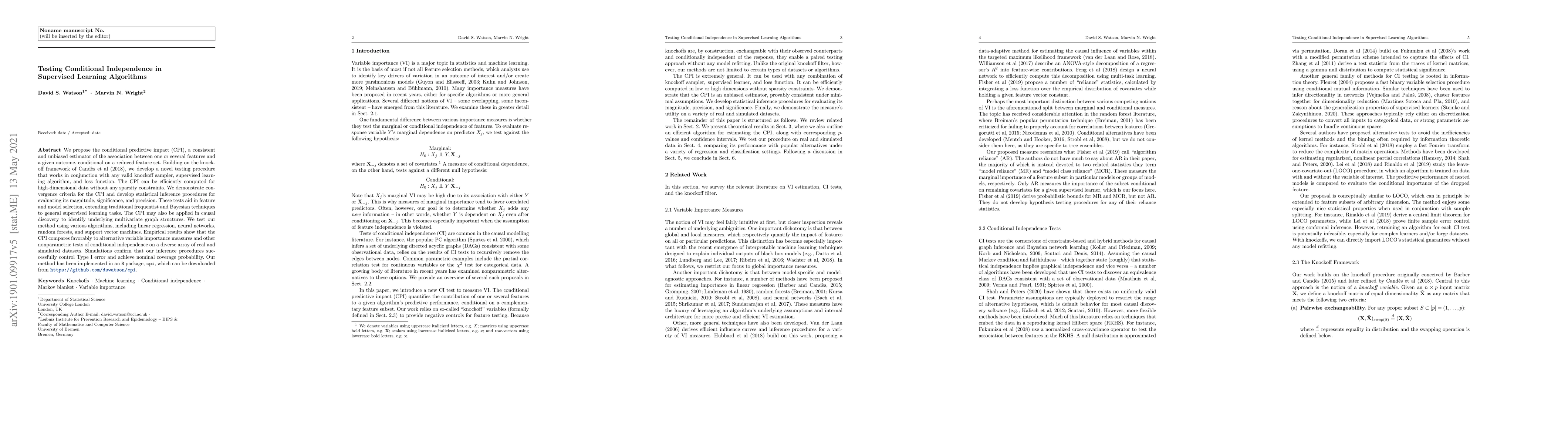 We propose the conditional predictive impact (CPI), a consistent and unbiased estimator of the association between one or several features and a given outcome, conditional on a reduced feature set. Building on the knockoff framework of Cand\`es et al. (2018), we develop a novel testing procedure that works in conjunction with any valid knockoff sampler, supervised learning algorithm, and loss function. The CPI can be efficiently computed for high-dimensional data without any sparsity constraints. We demonstrate convergence criteria for the CPI and develop statistical inference procedures for evaluating its magnitude, significance, and precision. These tests aid in feature and model selection, extending traditional frequentist and Bayesian techniques to general supervised learning tasks. The CPI may also be applied in causal discovery to identify underlying multivariate graph structures. We test our method using various algorithms, including linear regression, neural networks, random forests, and support vector machines. Empirical results show that the CPI compares favorably to alternative variable importance measures and other nonparametric tests of conditional independence on a diverse array of real and simulated datasets. Simulations confirm that our inference procedures successfully control Type I error and achieve nominal coverage probability. Our method has been implemented in an R package, cpi, which can be downloaded from https://github.com/dswatson/cpi.
