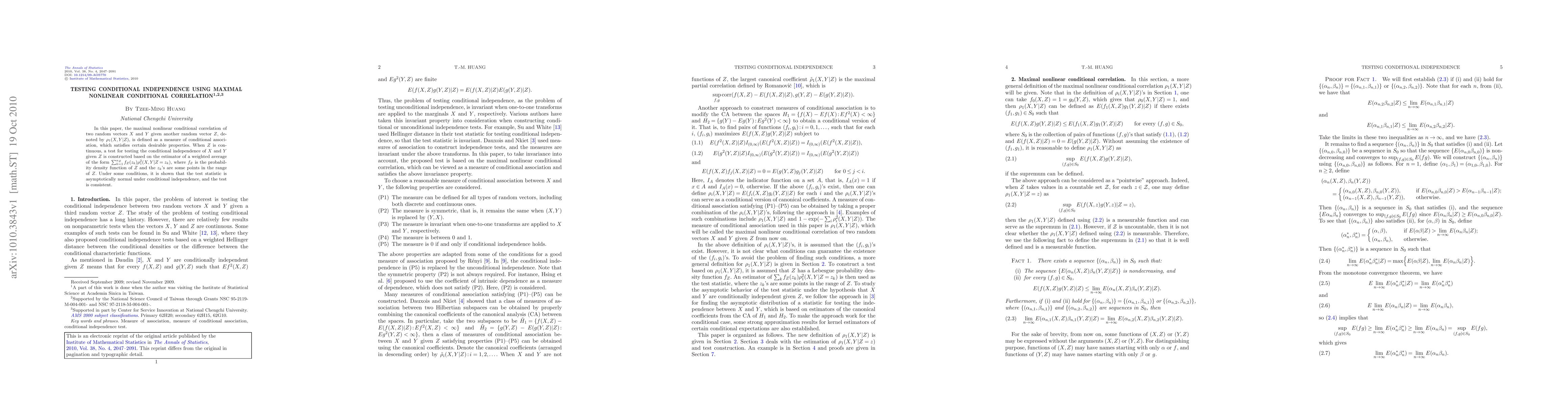 This paper introduces maximal nonlinear conditional correlation to measure conditional association between random vectors $X$ and $Y$ given $Z$. It constructs a test for conditional independence based on an estimator, showing the test statistic is asymptotically normal and consistent under certain conditions.