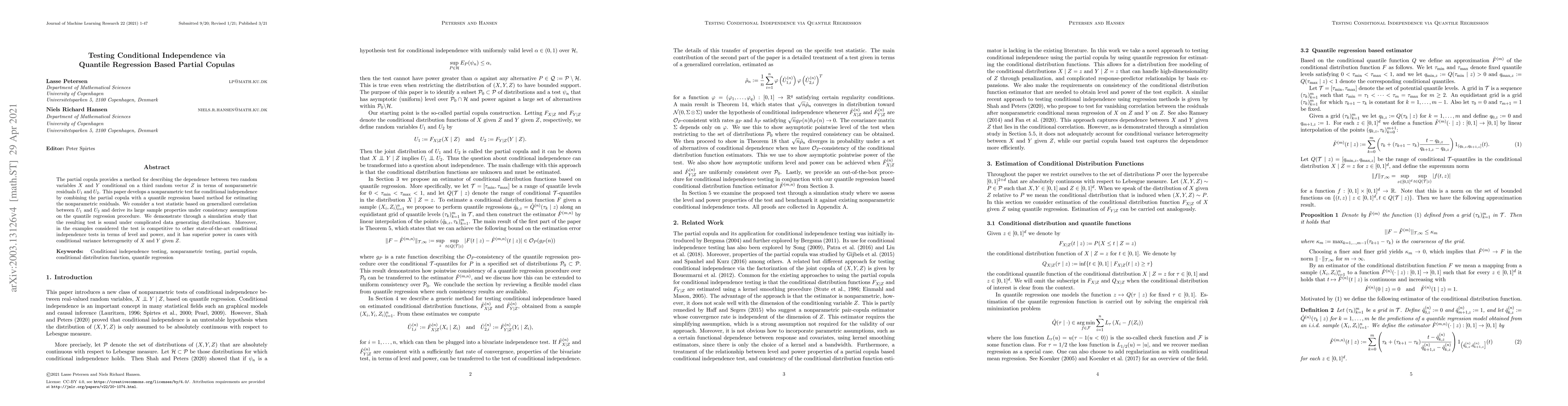 This paper develops a nonparametric test for conditional independence using partial copulas and quantile regression to estimate residuals. The test is shown to be competitive with other methods in simulations and exhibits superior power under conditional variance heterogeneity.
