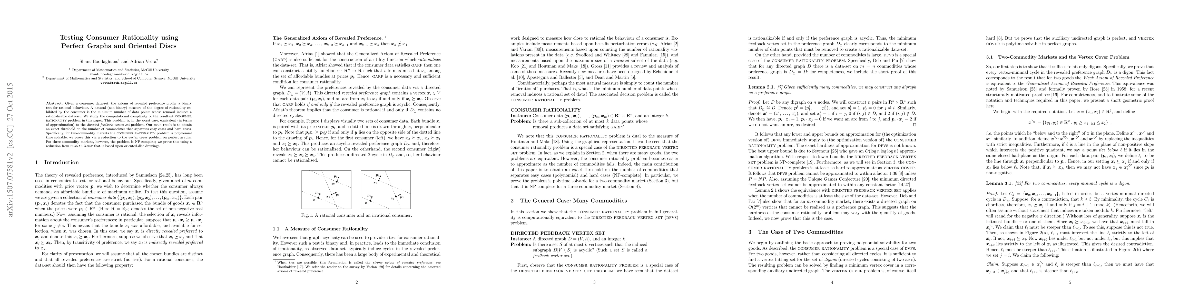 Researchers studied consumer rationality using perfect graphs and oriented discs to determine how many data points can be removed before a dataset becomes rationalizable. They found that for two-commodity markets, the problem is polynomial time solvable, but for three-commodity markets, it is NP-complete.