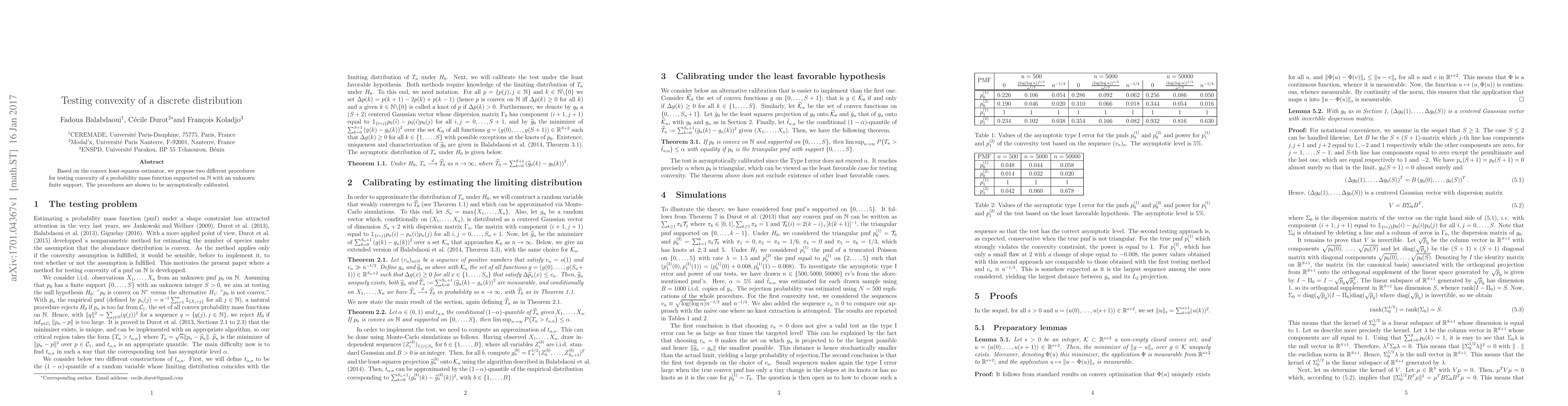 Summary: This paper proposes two procedures for testing the convexity of a discrete probability mass function using the convex least-squares estimator, demonstrating their asymptotic calibration.