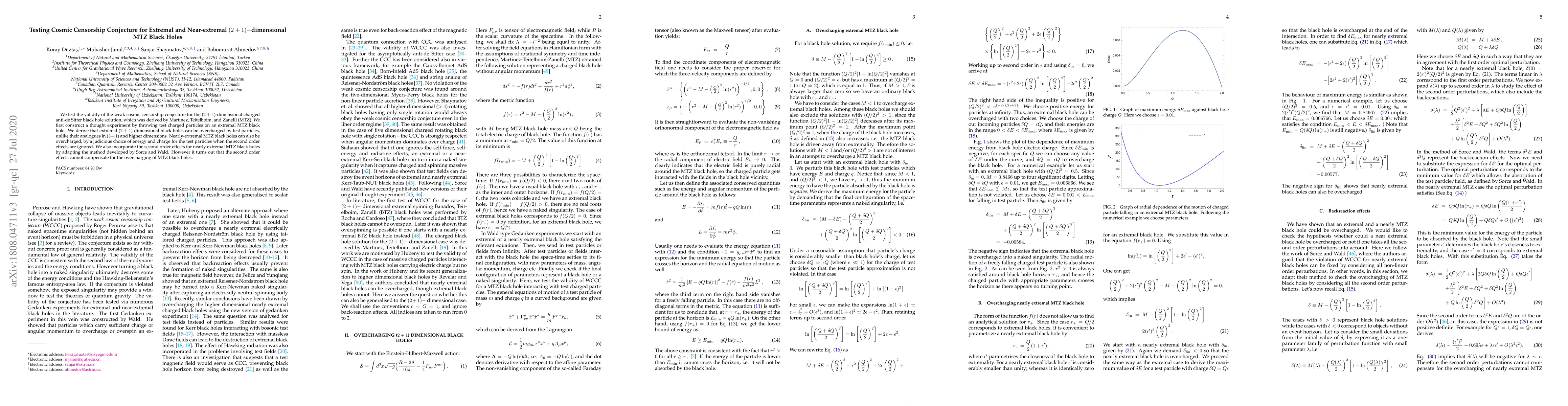 This paper tests the weak cosmic censorship conjecture for ($2+1$)-dimensional MTZ black holes by throwing test charged particles at them. It finds that extremal black holes can be overcharged, while nearly-extremal black holes obey the conjecture when second order effects are considered.