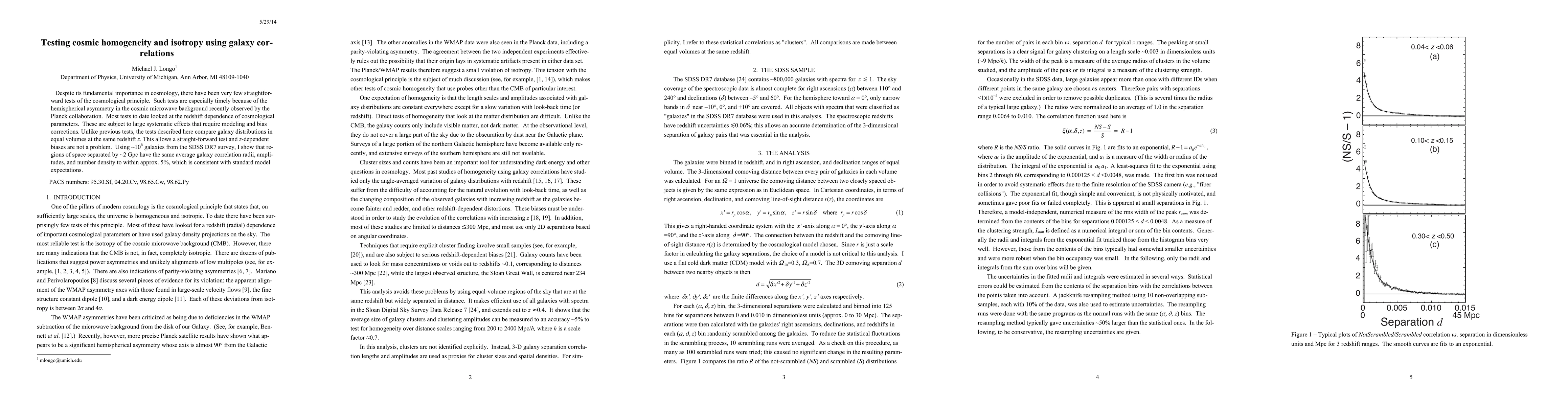 This paper tests cosmic homogeneity and isotropy by comparing galaxy correlations in equal volumes at the same redshift, using ~10^6 galaxies from SDSS DR7. Results show no significant differences in galaxy correlation properties across regions separated by ~2 Gpc, supporting the cosmological principle within 5%.