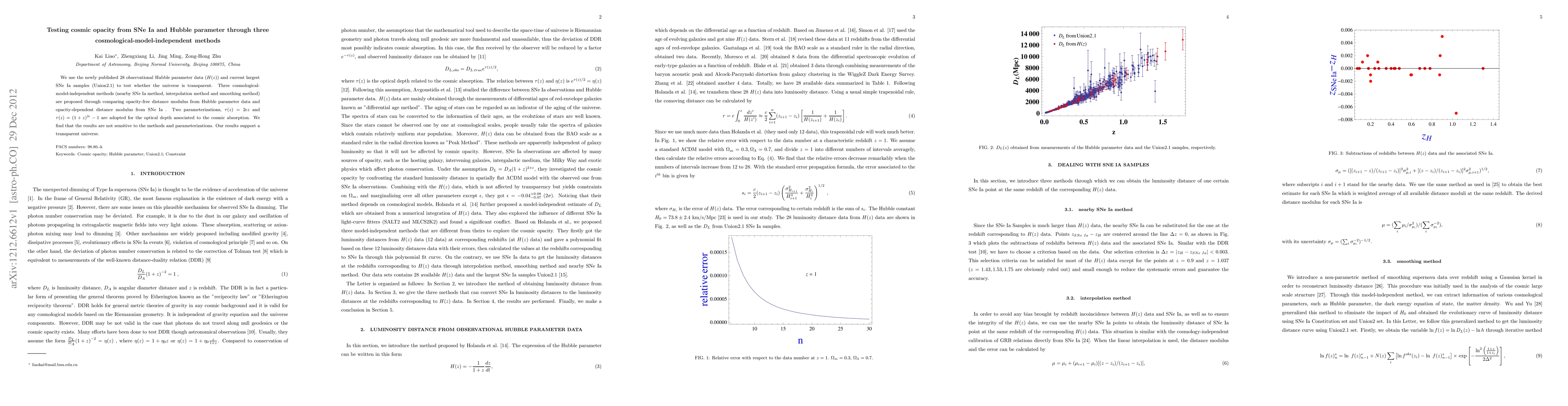 This paper tests cosmic opacity using three model-independent methods and two observational datasets: Hubble parameter data and SNe Ia. The findings suggest that the universe is transparent, as no significant cosmic absorption is detected across different methods and parameterizations.