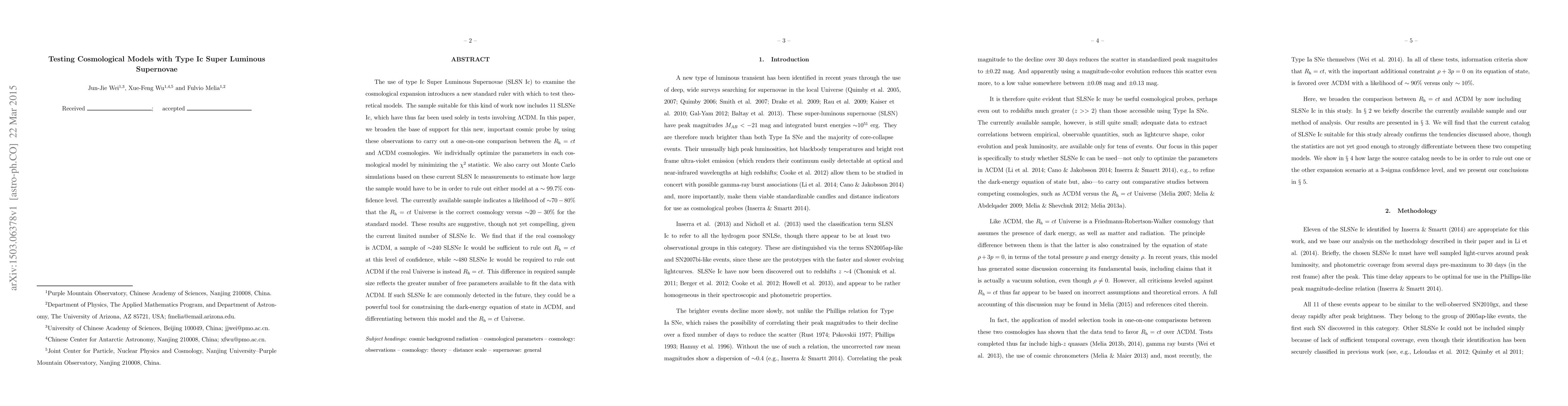 The use of type Ic Super Luminous Supernovae (SLSN Ic) to examine the cosmological expansion introduces a new standard ruler with which to test theoretical models. The sample suitable for this kind of work now includes 11 SLSNe Ic, which have thus far been used solely in tests involving $\Lambda$CDM. In this paper, we broaden the base of support for this new, important cosmic probe by using these observations to carry out a one-on-one comparison between the $R_{\rm h}=ct$ and $\Lambda$CDM cosmologies. We individually optimize the parameters in each cosmological model by minimizing the $\chi^{2}$ statistic. We also carry out Monte Carlo simulations based on these current SLSN Ic measurements to estimate how large the sample would have to be in order to rule out either model at a $\sim 99.7\%$ confidence level. The currently available sample indicates a likelihood of $\sim$$70-80\%$ that the $R_{\rm h}=ct$ Universe is the correct cosmology versus $\sim$$20-30\%$ for the standard model. These results are suggestive, though not yet compelling, given the current limited number of SLSNe Ic. We find that if the real cosmology is $\Lambda$CDM, a sample of $\sim$$240$ SLSNe Ic would be sufficient to rule out $R_{\rm h}=ct$ at this level of confidence, while $\sim$$480$ SLSNe Ic would be required to rule out $\Lambda$CDM if the real Universe is instead $R_{\rm h}=ct$. This difference in required sample size reflects the greater number of free parameters available to fit the data with $\Lambda$CDM. If such SLSNe Ic are commonly detected in the future, they could be a powerful tool for constraining the dark-energy equation of state in $\Lambda$CDM, and differentiating between this model and the $R_{\rm h}=ct$ Universe.