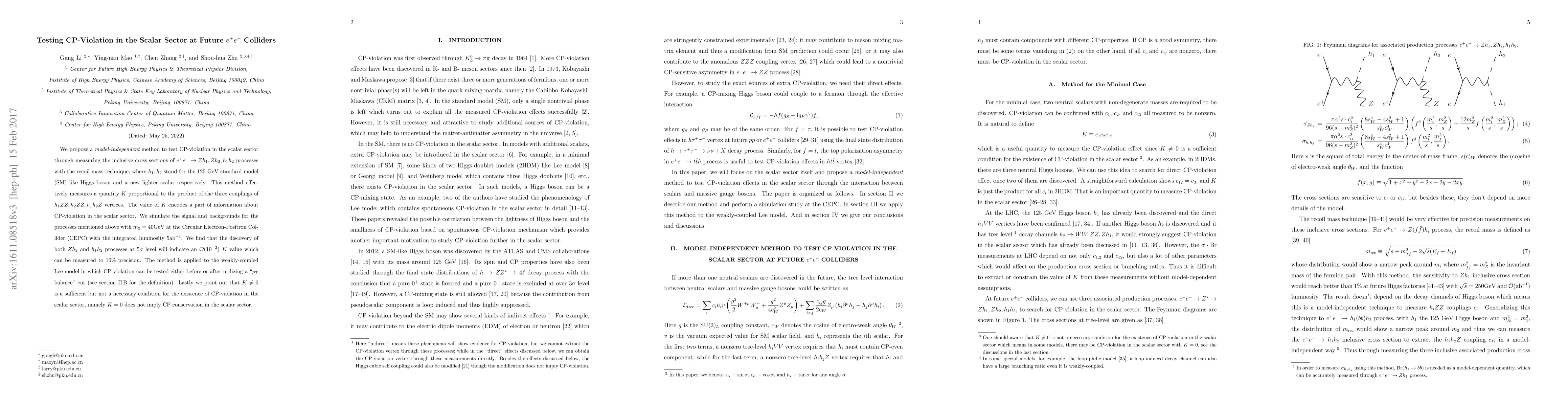 We propose a {\em model-independent} method to test CP-violation in the scalar sector through measuring the inclusive cross sections of $e^+e^-\rightarrow Zh_1,Zh_2,h_1h_2$ processes with the recoil mass technique, where $h_1, h_2$ stand for the 125 GeV standard model (SM) like Higgs boson and a new lighter scalar respectively. This method effectively measures a quantity $K$ proportional to the product of the three couplings of $h_1ZZ,h_2ZZ,h_1h_2Z$ vertices. The value of $K$ encodes a part of information about CP-violation in the scalar sector. We simulate the signal and backgrounds for the processes mentioned above with $m_{2}=40\textrm{GeV}$ at the Circular Electron-Positron Collider (CEPC) with the integrated luminosity $5\textrm{ab}^{-1}$. We find that the discovery of both $Zh_2$ and $h_1h_2$ processes at $5\sigma$ level will indicate an $\mathcal{O}(10^{-2})$ $K$ value which can be measured to $16\%$ precision. The method is applied to the weakly-coupled Lee model in which CP-violation can be tested either before or after utilizing a "$p_T$ balance" cut (see \autoref{simu} for the definition). Lastly we point out that $K\neq 0$ is a sufficient but not a necessary condition for the existence of CP-violation in the scalar sector, namely $K = 0$ does not imply CP conservation in the scalar sector.