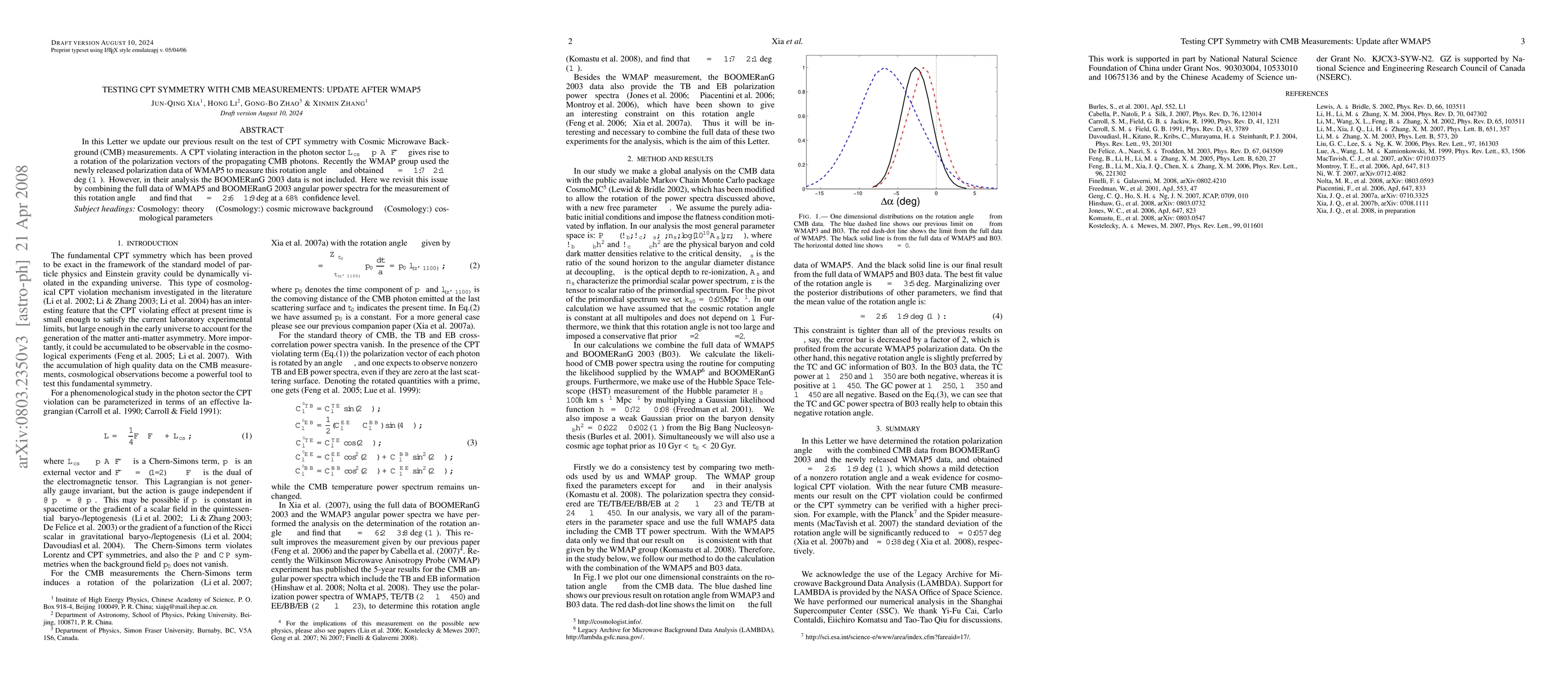 This paper updates the test of CPT symmetry using Cosmic Microwave Background (CMB) measurements, finding a rotation angle $\Delta\alpha=-2.6\pm1.9$ deg from combined WMAP5 and BOOMERanG 2003 data, indicating no significant CPT violation.