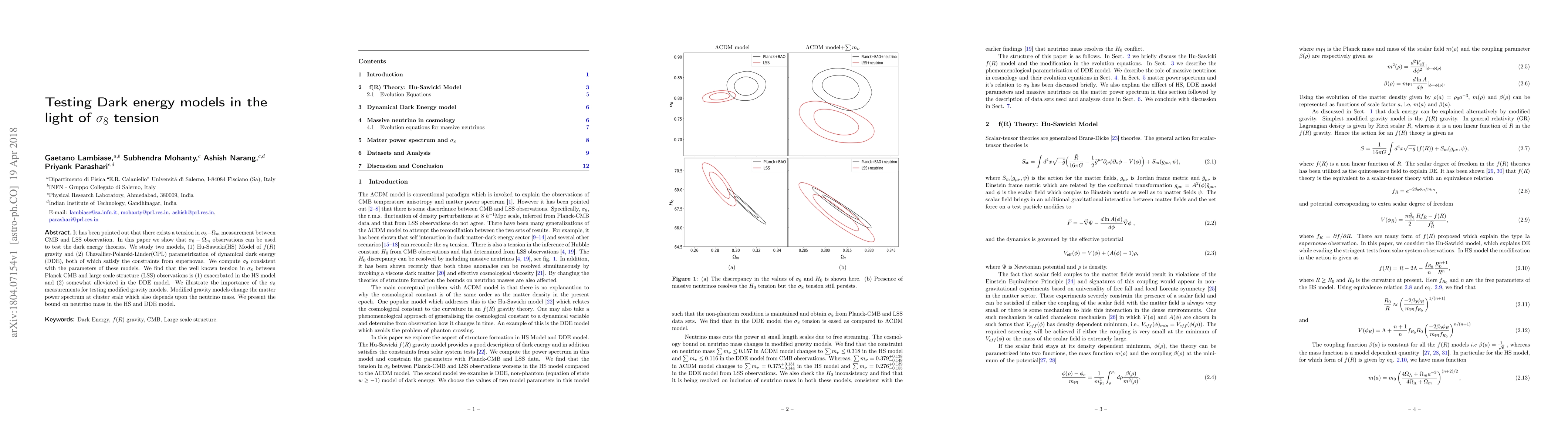 It has been pointed out that there exists a tension in $\sigma_8-\Omega_m$ measurement between CMB and LSS observation. In this paper we show that $\sigma_8-\Omega_m$ observations can be used to test the dark energy theories. We study two models, (1) Hu-Sawicki(HS) Model of $f(R)$ gravity and (2) Chavallier-Polarski-Linder(CPL) parametrization of dynamical dark energy (DDE), both of which satisfy the constraints from supernovae. We compute $\sigma_8$ consistent with the parameters of these models. We find that the well known tension in $\sigma_8$ between Planck CMB and large scale structure (LSS) observations is (1) exacerbated in the HS model and (2) somewhat alleviated in the DDE model. We illustrate the importance of the $\sigma_8$ measurements for testing modified gravity models. Modified gravity models change the matter power spectrum at cluster scale which also depends upon the neutrino mass. We present the bound on neutrino mass in the HS and DDE model.