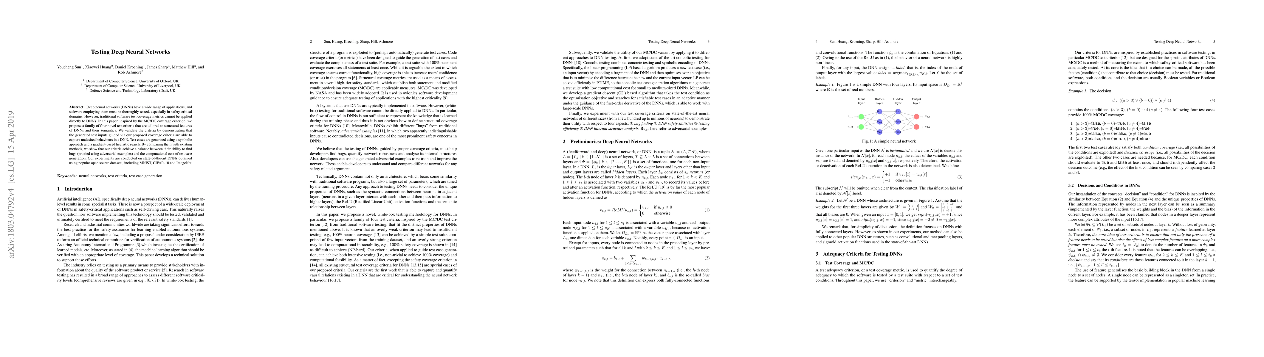 Deep neural networks (DNNs) have a wide range of applications, and software employing them must be thoroughly tested, especially in safety-critical domains. However, traditional software test coverage metrics cannot be applied directly to DNNs. In this paper, inspired by the MC/DC coverage criterion, we propose a family of four novel test criteria that are tailored to structural features of DNNs and their semantics. We validate the criteria by demonstrating that the generated test inputs guided via our proposed coverage criteria are able to capture undesired behaviours in a DNN. Test cases are generated using a symbolic approach and a gradient-based heuristic search. By comparing them with existing methods, we show that our criteria achieve a balance between their ability to find bugs (proxied using adversarial examples) and the computational cost of test case generation. Our experiments are conducted on state-of-the-art DNNs obtained using popular open source datasets, including MNIST, CIFAR-10 and ImageNet.