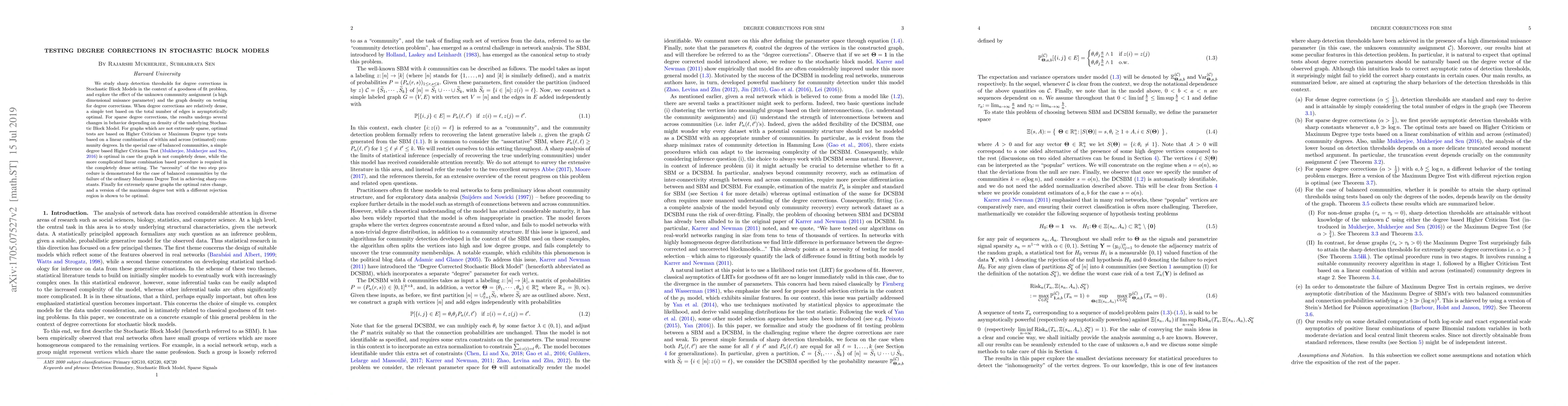 We study sharp detection thresholds for degree corrections in Stochastic Block Models in the context of a goodness of fit problem, and explore the effect of the unknown community assignment (a high dimensional nuisance parameter) and the graph density on testing for degree corrections. When degree corrections are relatively dense, a simple test based on the total number of edges is asymptotically optimal. For sparse degree corrections, the results undergo several changes in behavior depending on density of the underlying Stochastic Block Model. For graphs which are not extremely sparse, optimal tests are based on Higher Criticism or Maximum Degree type tests based on a linear combination of within and across (estimated) community degrees. In the special case of balanced communities, a simple degree based Higher Criticism Test (Mukherjee, Mukherjee, Sen 2016) is optimal in case the graph is not completely dense, while the more complicated linear combination based procedure is required in the completely dense setting. The ``necessity" of the two step procedure is demonstrated for the case of balanced communities by the failure of the ordinary Maximum Degree Test in achieving sharp constants. Finally for extremely sparse graphs the optimal rates change, and a version of the maximum degree test with a different rejection region is shown to be optimal.