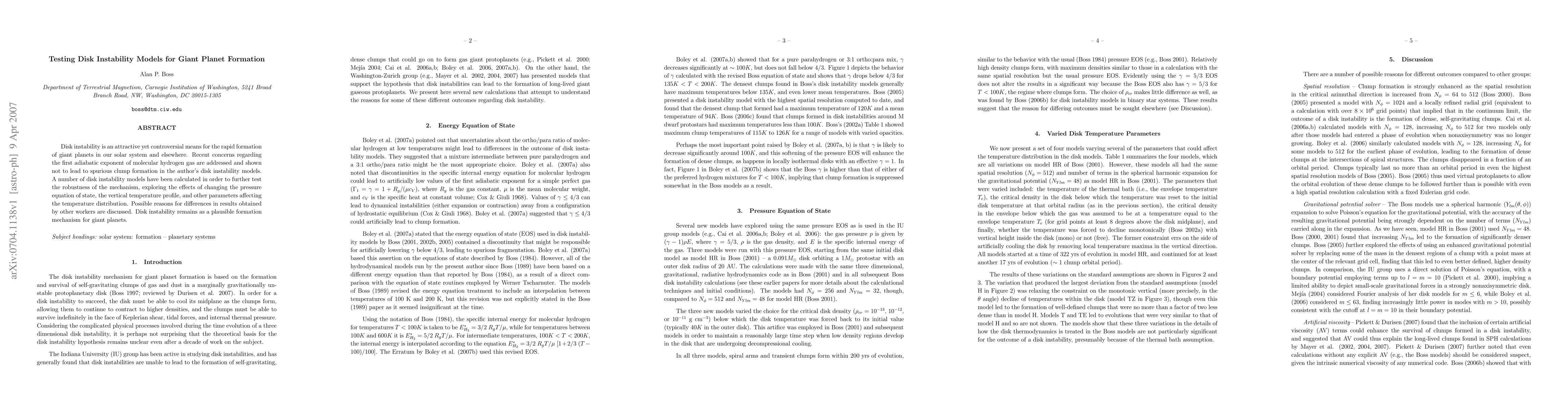 This paper tests disk instability models for giant planet formation, addressing concerns about the first adiabatic exponent of molecular hydrogen gas, and finds no spurious clump formation. The study explores various parameters to ensure robustness, concluding that disk instability remains a plausible formation mechanism.
