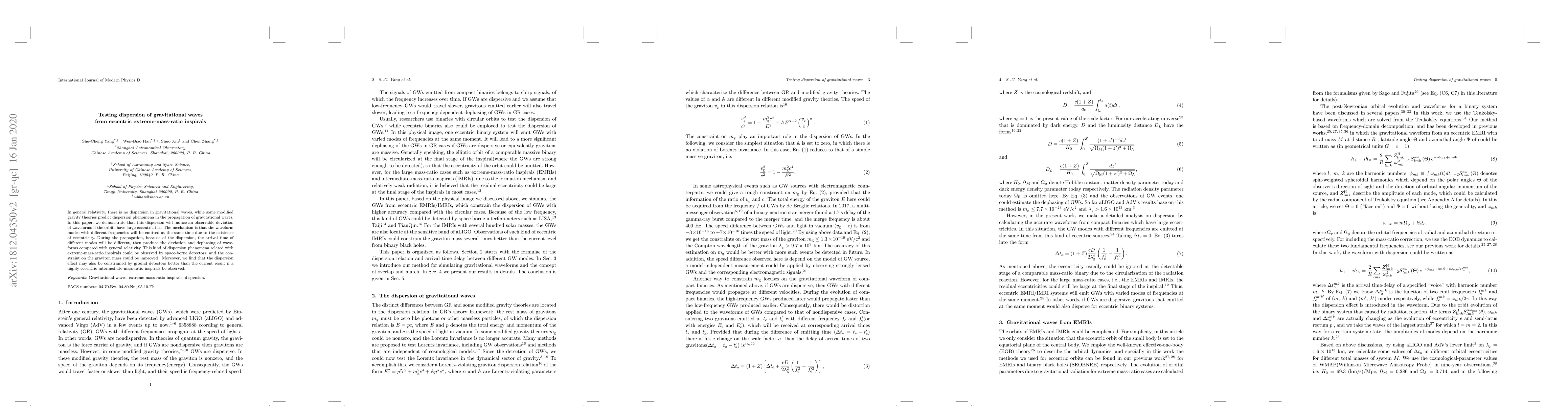 This paper investigates gravitational wave dispersion in modified gravity theories, predicting that dispersion will cause waveform deviations in eccentric extreme-mass-ratio inspirals. Such effects could be detected by space-borne and potentially ground-based detectors, improving constraints on graviton mass.