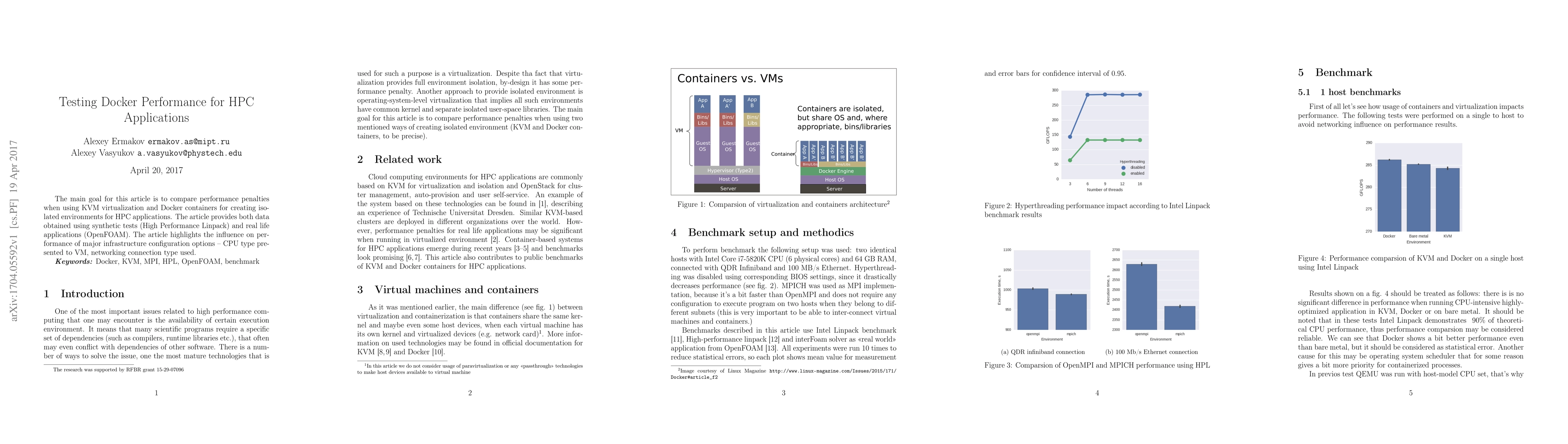 This paper compares the performance of HPC applications running in KVM virtualization versus Docker containers, using synthetic tests and real-life applications to evaluate the impact of infrastructure configuration options like CPU type and networking connection type on application performance.