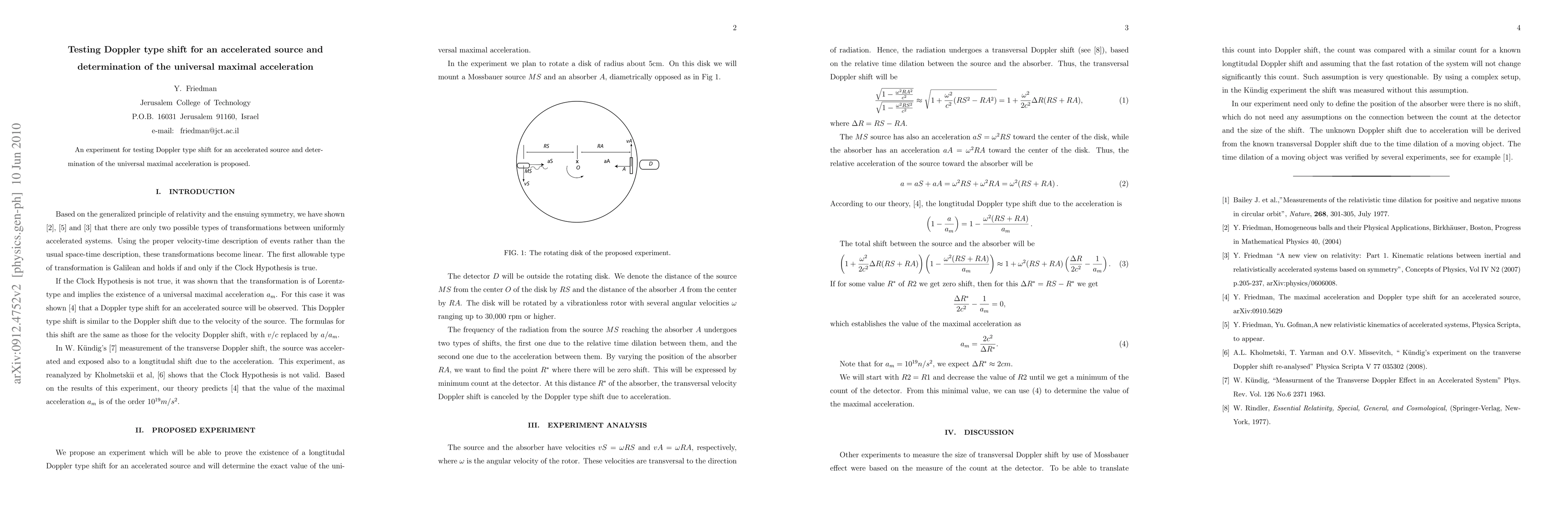 An experiment for testing Doppler type shift for an accelerated source and determination of the universal maximal acceleration is proposed.