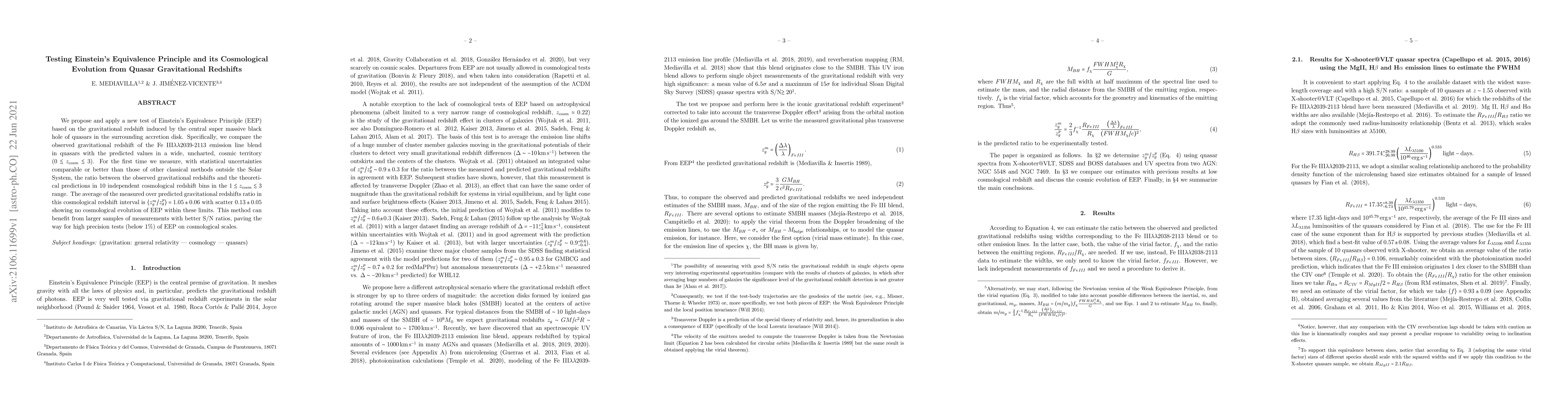 This paper proposes a new test of Einstein's Equivalence Principle using quasar gravitational redshifts, comparing observed redshifts of Fe III emission lines with theoretical predictions across cosmological redshifts ($0 \lesssim z_{cosm}\lesssim3$). The results show no significant cosmological evolution of EEP within this range, with a measured to predicted redshift ratio of $1.05\pm 0.06$.