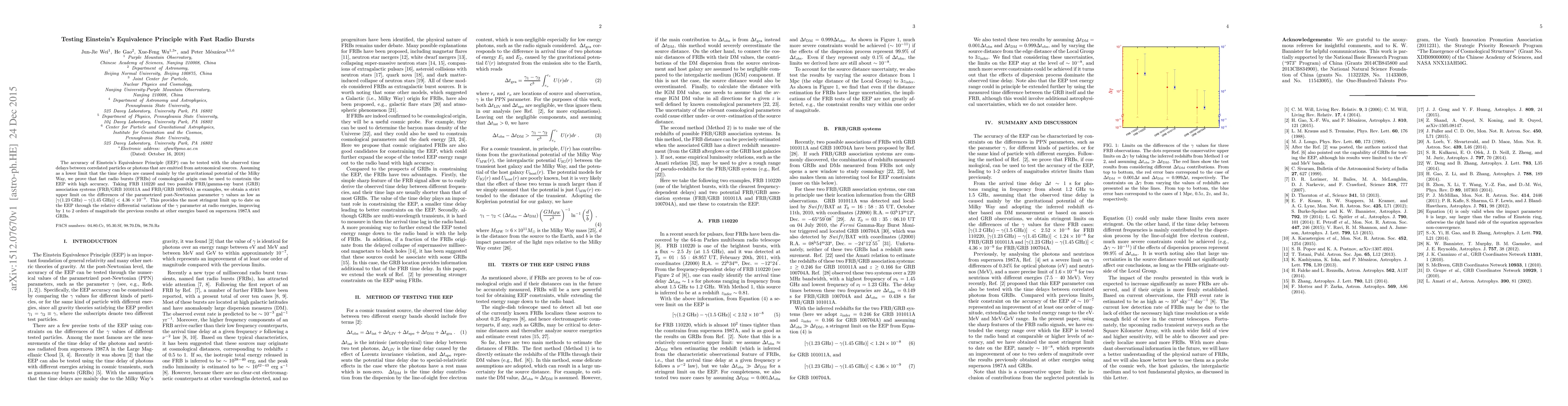 This paper tests Einstein's Equivalence Principle using fast radio bursts (FRBs) to measure time delays between correlated particles or photons. The study finds the most stringent limit to date on the differences in the parametrized post-Newtonian parameter $\gamma$ at radio frequencies, improving previous results by 1 to 2 orders of magnitude.
