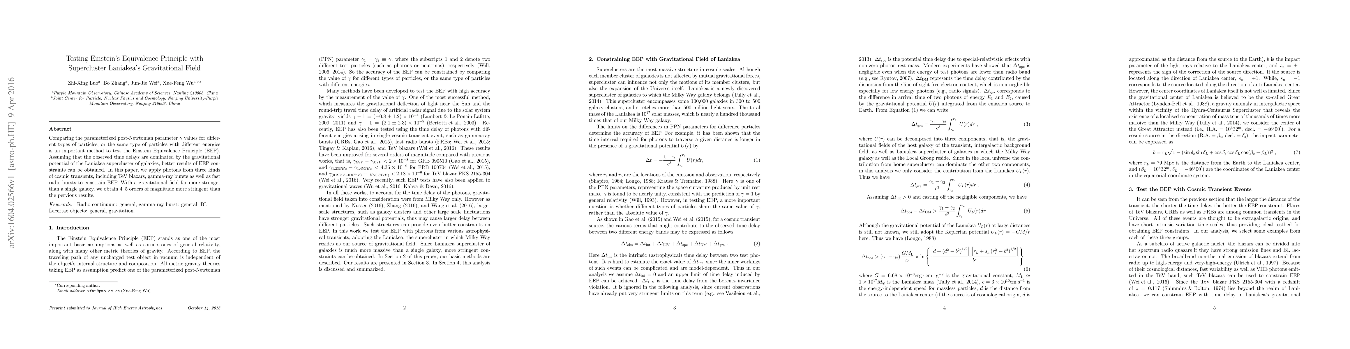 This paper tests Einstein's Equivalence Principle (EEP) using photons from TeV blazars, gamma-ray bursts, and fast radio bursts passing through the Laniakea supercluster's gravitational field, achieving 4-5 orders of magnitude more stringent constraints than previous results. The study compares $\gamma$ values for different particle types and energies to validate EEP.
