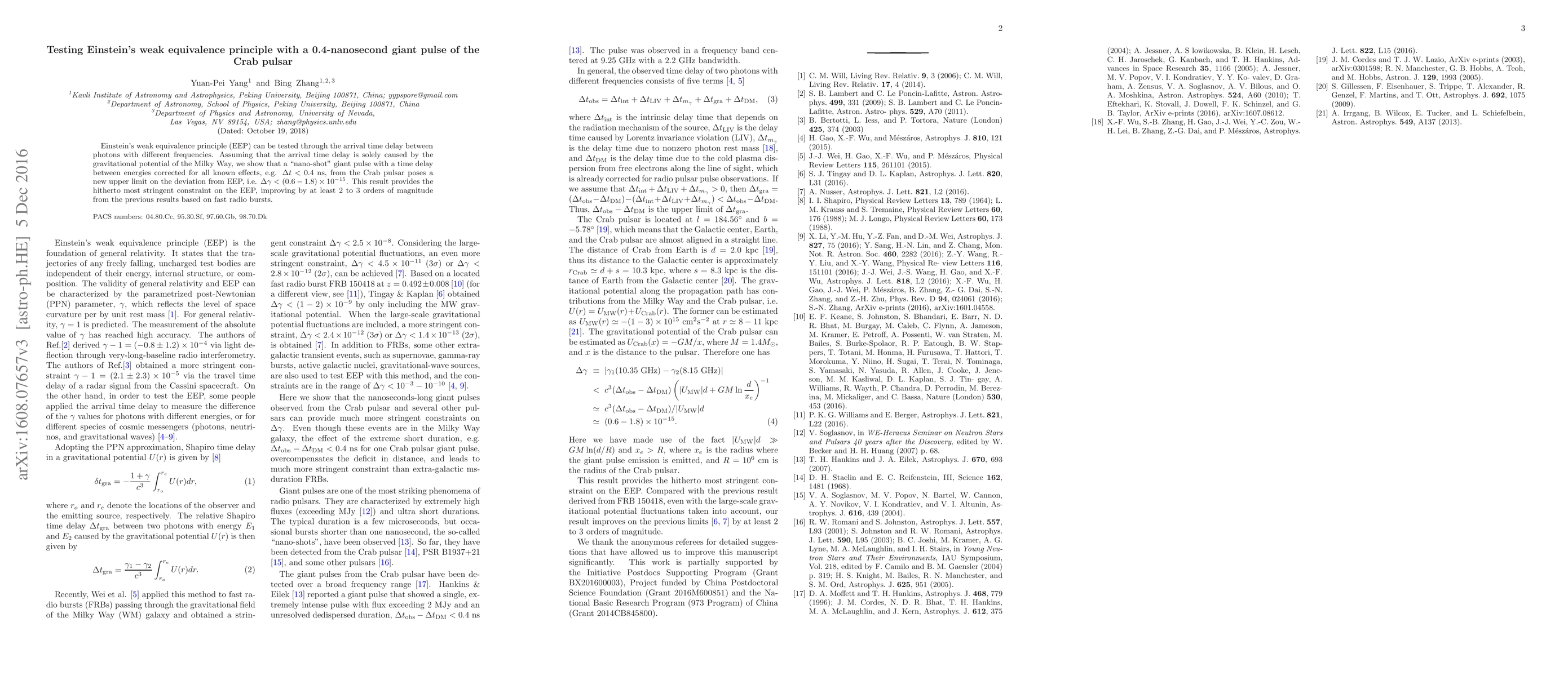 This paper tests Einstein's weak equivalence principle by analyzing the arrival time delay of a 0.4-nanosecond giant pulse from the Crab pulsar, finding a new upper limit on the deviation from EEP as $\Delta\gamma < (0.6-1.8)\times 10^{-15}$, which improves previous constraints by 2 to 3 orders of magnitude.