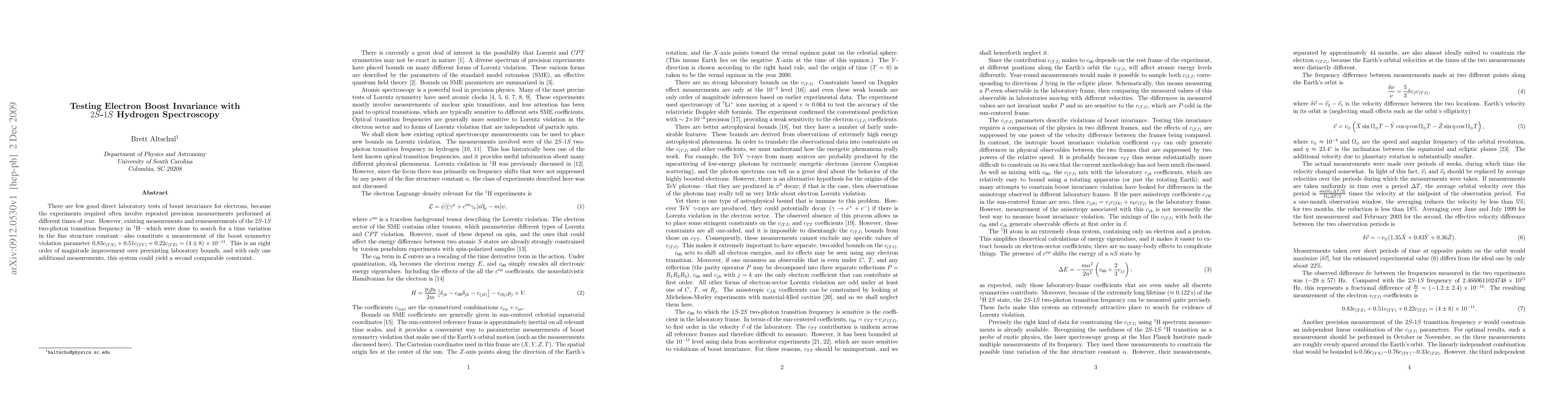 There are few good direct laboratory tests of boost invariance for electrons, because the experiments required often involve repeated precision measurements performed at different times of year. However, existing measurements and remeasurements of the 2S-1S two-photon transition frequency in H--which were done to search for a time variation in the fine structure constant--also constitute a measurement of the boost symmetry violation parameter 0.83c_(TX) + 0.51c_(TY) + 0.22c_(TZ) = (4 +/- 8) x 10^(-11). This is an eight order of magnitude improvement over preexisting laboratory bounds, and with only one additional measurements, this system could yield a second comparable constraint.