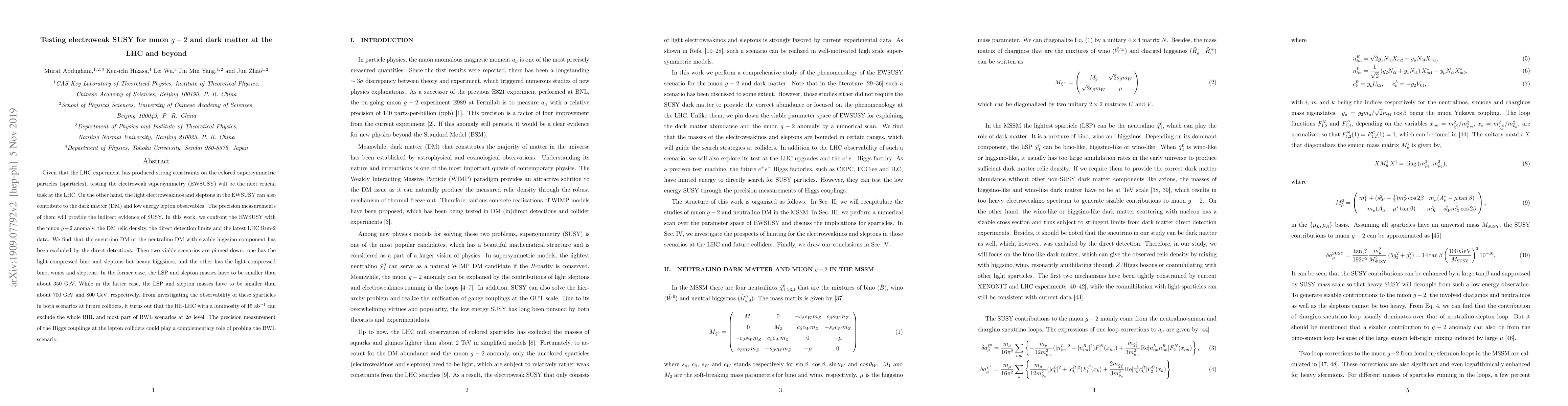This paper examines electroweak supersymmetry (EWSUSY) in light of the muon $g-2$ anomaly, dark matter (DM) constraints, and LHC data. It finds two viable EWSUSY scenarios: one with light binos and sleptons but heavy higgsinos, and another with light binos, winos, and sleptons. Future colliders like the HE-LHC could further test these scenarios, while precision Higgs measurements at lepton colliders may probe the latter.