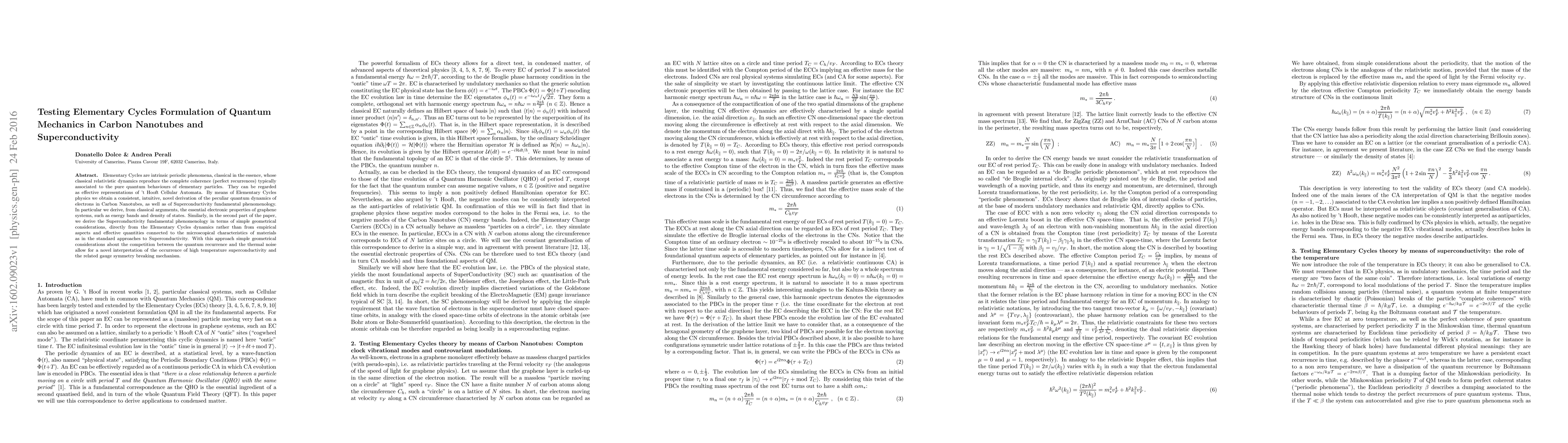Elementary Cycles are intrinsic periodic phenomena, classical in the essence, whose classical relativistic dynamics reproduce the complete coherence (perfect recurrences) typically associated to the pure quantum behaviours of elementary particles. They can be regarded as effective representations of 't Hooft Cellular Automata. By means of Elementary Cycles physics we obtain a consistent, intuitive, novel derivation of the peculiar quantum dynamics of electrons in Carbon Nanotubes, as well as of Superconductivity fundamental phenomenology. In particular we derive, from classical arguments, the essential electronic properties of graphene systems, such as energy bands and density of states. Similarly, in the second part of the paper, we derive the Superconductivity fundamental phenomenology in terms of simple geometrical considerations, directly from the Elementary Cycles dynamics rather than from empirical aspects and effective quantities connected to the microscopical characteristics of materials as in the standard approaches to Superconductivity. With this approach simple geometrical considerations about the competition between the quantum recurrence and the thermal noise allow for a novel interpretation of the occurrence of high temperature superconductivity and the related gauge symmetry breaking mechanism.