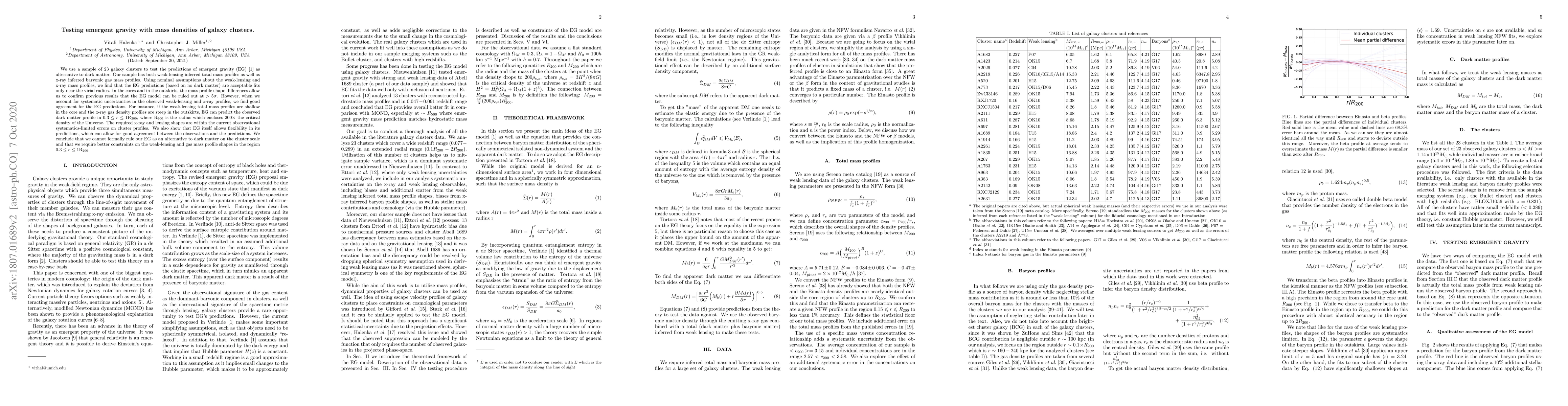 This paper tests emergent gravity (EG) as an alternative to dark matter using galaxy clusters, finding that EG fits observed mass profiles only with systematic uncertainties accounted for. While EG cannot be ruled out entirely, better observational constraints are needed to confirm its viability.