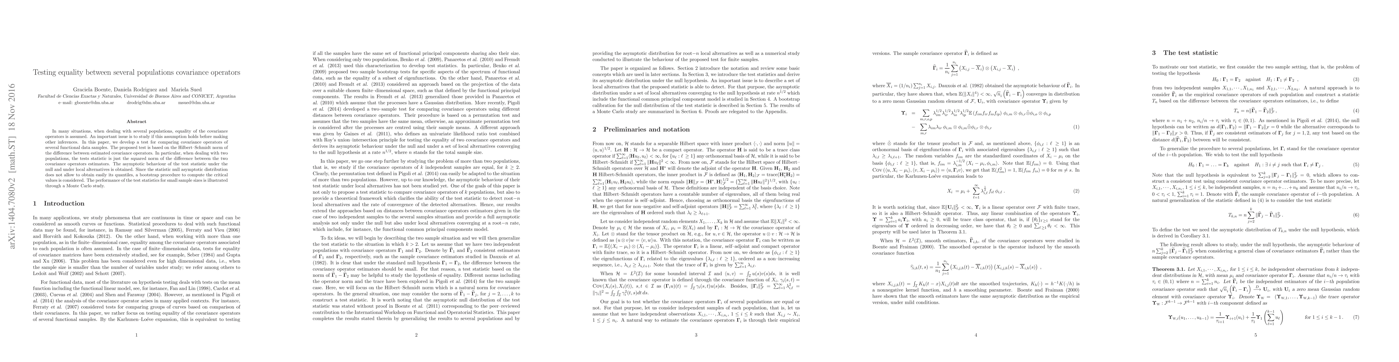 This paper develops a test to compare covariance operators across several functional data samples, based on the Hilbert-Schmidt norm. It uses a bootstrap procedure to determine critical values due to the complex null asymptotic distribution, and evaluates the test through a Monte Carlo study for small sample sizes.