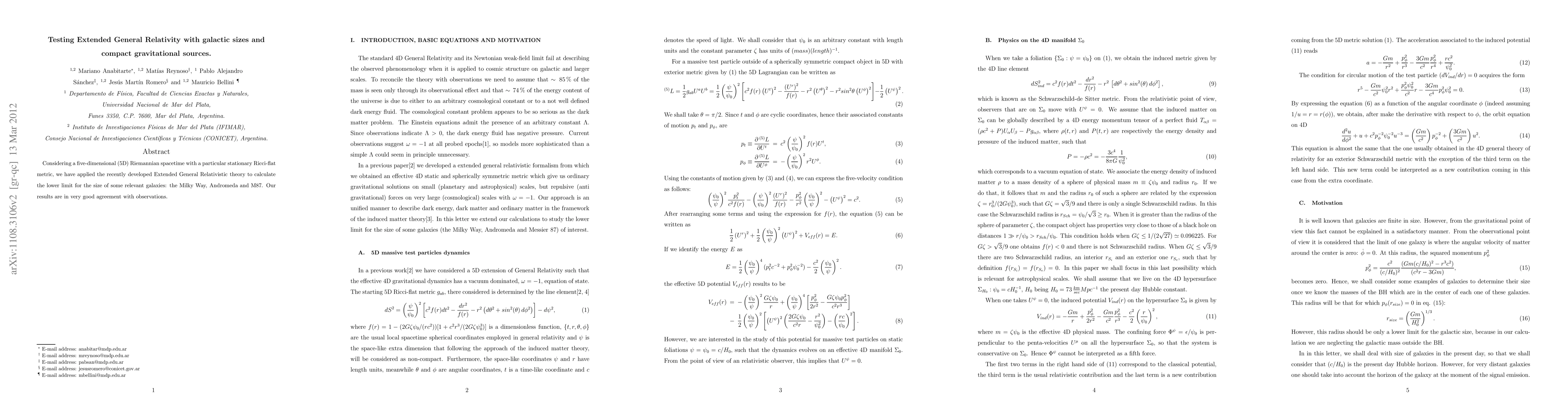 Considering a five-dimensional (5D) Riemannian spacetime with a particular stationary Ricci-flat metric, we have applied the recently developed Extended General Relativistic theory to calculate the lower limit for the size of some relevant galaxies: the Milky Way, Andromeda and M87. Our results are in very good agreement with observations.