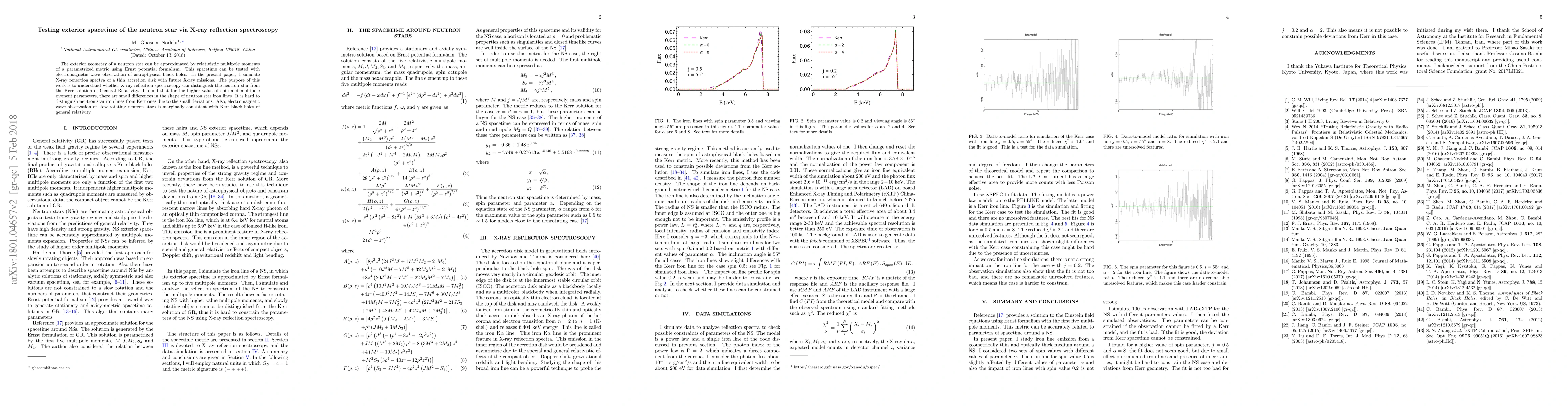The exterior geometry of a neutron star can be approximated by relativistic multipole moments of a parametrized metric using Ernst potential formalism. This spacetime can be tested with electromagnetic wave observation of astrophysical black holes. In the present paper, I simulate X-ray reflection spectra of a thin accretion disk with future X-ray missions. The purpose of this work is to understand whether X-ray reflection spectroscopy can distinguish the neutron star from the Kerr solution of General Relativity. I found that for the higher value of spin and multipole moment parameters, there are small differences in the shape of neutron star iron lines. It is hard to distinguish neutron star iron lines from Kerr ones due to the small deviations. Also, electromagnetic wave observation of slow rotating neutron stars is marginally consistent with Kerr black holes of general relativity.