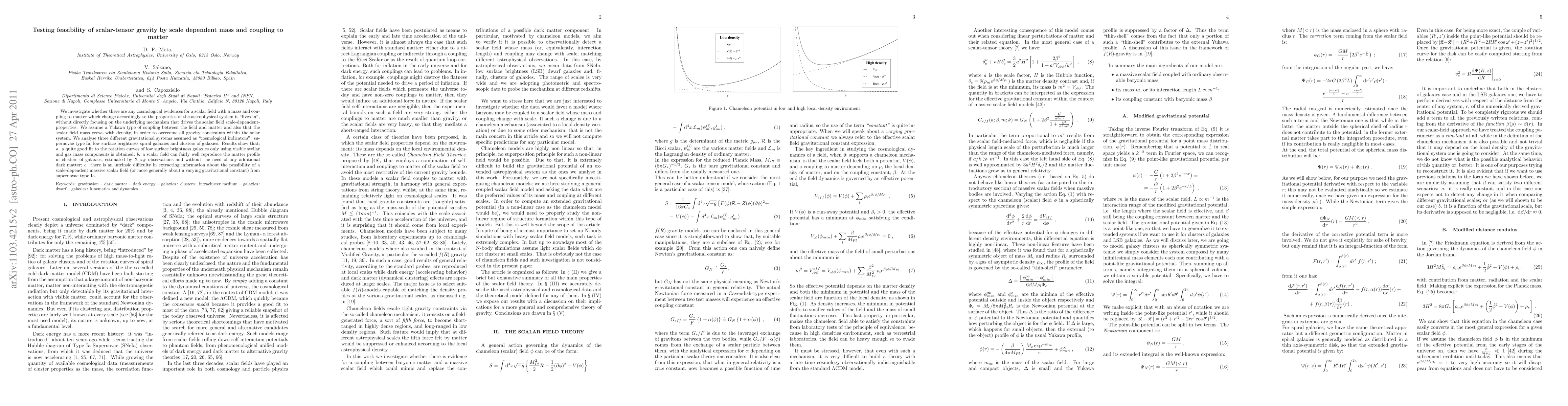 This paper explores the feasibility of scalar-tensor gravity through a scalar field with scale-dependent mass and coupling to matter, using three cosmological systems. Results indicate that the scalar field can explain rotation curves in low-surface brightness galaxies and cluster mass profiles without dark matter, but extracting evidence from supernovae type Ia is challenging.