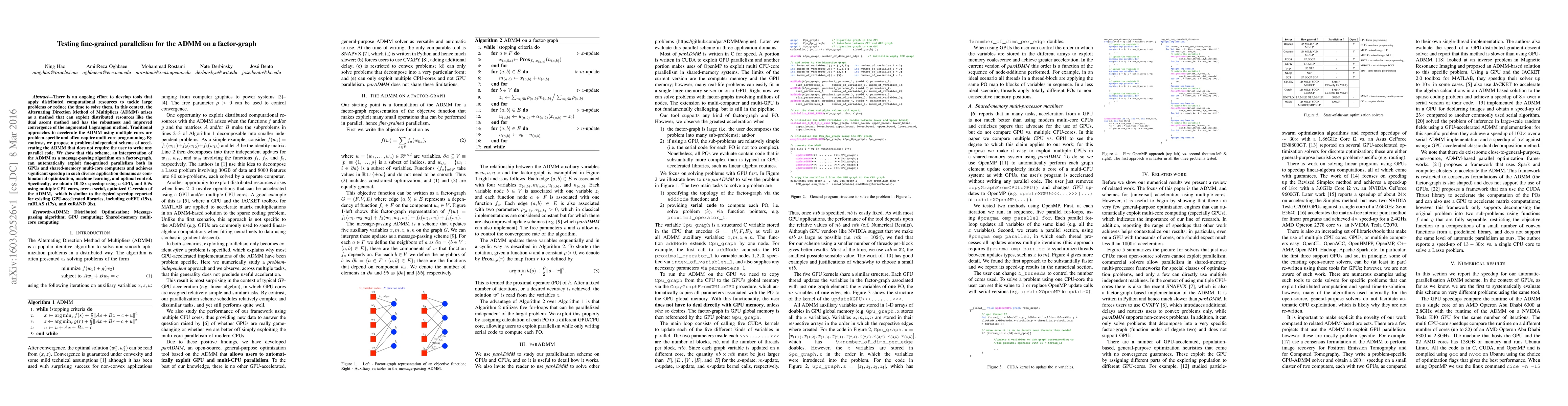 There is an ongoing effort to develop tools that apply distributed computational resources to tackle large problems or reduce the time to solve them. In this context, the Alternating Direction Method of Multipliers (ADMM) arises as a method that can exploit distributed resources like the dual ascent method and has the robustness and improved convergence of the augmented Lagrangian method. Traditional approaches to accelerate the ADMM using multiple cores are problem-specific and often require multi-core programming. By contrast, we propose a problem-independent scheme of accelerating the ADMM that does not require the user to write any parallel code. We show that this scheme, an interpretation of the ADMM as a message-passing algorithm on a factor-graph, can automatically exploit fine-grained parallelism both in GPUs and shared-memory multi-core computers and achieves significant speedup in such diverse application domains as combinatorial optimization, machine learning, and optimal control. Specifically, we obtain 10-18x speedup using a GPU, and 5-9x using multiple CPU cores, over a serial, optimized C-version of the ADMM, which is similar to the typical speedup reported for existing GPU-accelerated libraries, including cuFFT (19x), cuBLAS (17x), and cuRAND (8x).