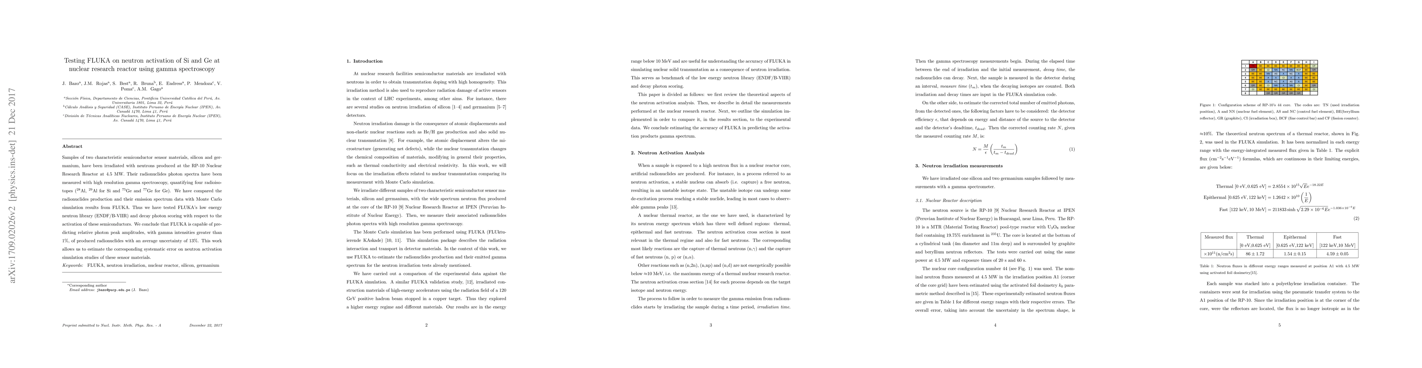 Samples of two characteristic semiconductor sensor materials, silicon and germanium, have been irradiated with neutrons produced at the RP-10 Nuclear Research Reactor at 4.5 MW. Their radionuclides photon spectra have been measured with high resolution gamma spectroscopy, quantifying four radioisotopes ($^{28}$Al, $^{29}$Al for Si and $^{75}$Ge and $^{77}$Ge for Ge). We have compared the radionuclides production and their emission spectrum data with Monte Carlo simulation results from FLUKA. Thus we have tested FLUKA's low energy neutron library (ENDF/B-VIIR) and decay photon scoring with respect to the activation of these semiconductors. We conclude that FLUKA is capable of predicting relative photon peak amplitudes, with gamma intensities greater than 1%, of produced radionuclides with an average uncertainty of 13%. This work allows us to estimate the corresponding systematic error on neutron activation simulation studies of these sensor materials.