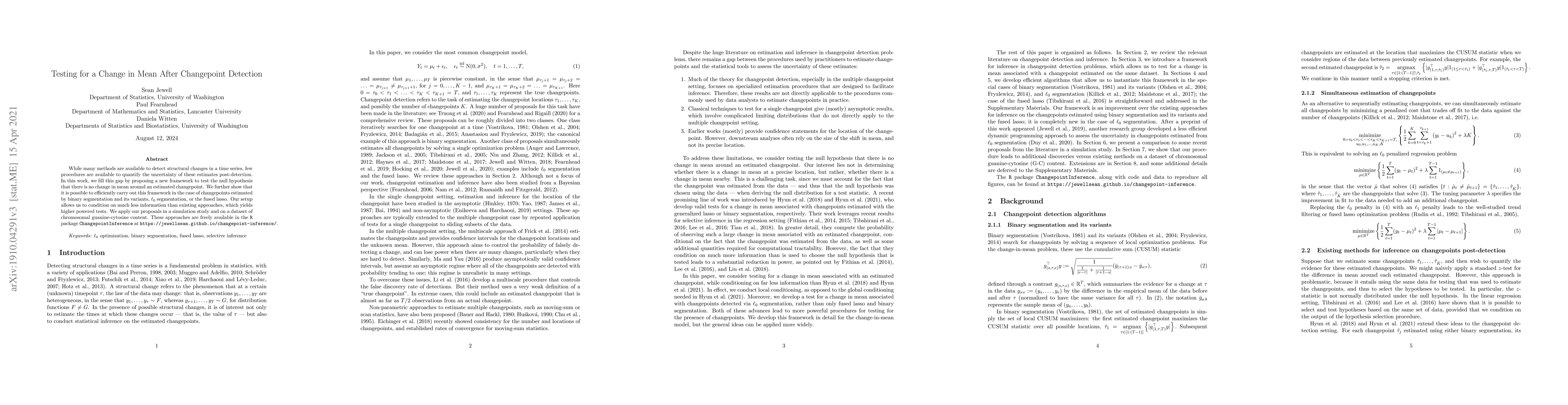 Researchers propose a new framework to test for changes in mean after changepoint detection, enabling higher powered tests with less information than existing approaches.