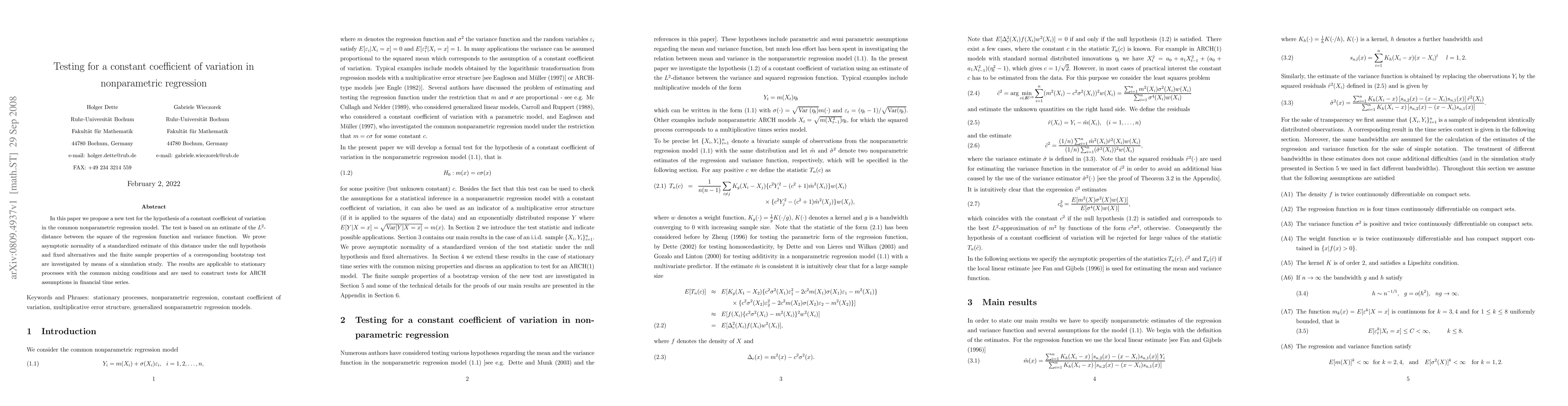 In this paper we propose a new test for the hypothesis of a constant coefficient of variation in the common nonparametric regression model. The test is based on an estimate of the $L^2$-distance between the square of the regression function and variance function. We prove asymptotic normality of a standardized estimate of this distance under the null hypothesis and fixed alternatives and the finite sample properties of a corresponding bootstrap test are investigated by means of a simulation study. The results are applicable to stationary processes with the common mixing conditions and are used to construct tests for ARCH assumptions in financial time series.