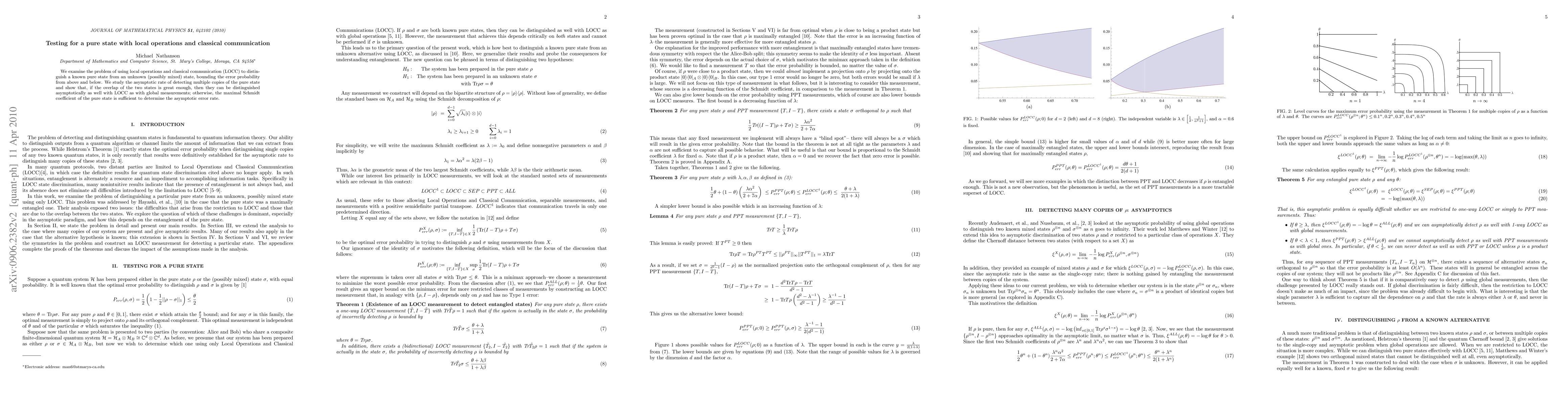 This paper investigates the use of local operations and classical communication (LOCC) to distinguish a known pure state from an unknown state, establishing bounds on error probabilities. It finds that for sufficiently high overlap, LOCC can achieve the same asymptotic detection rate as global measurements.