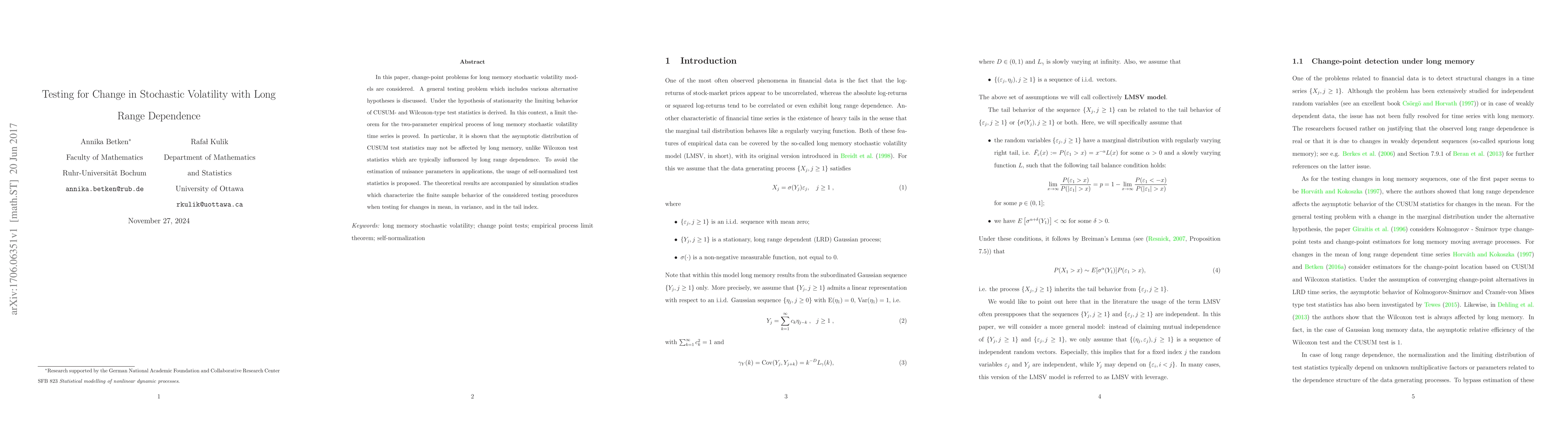 This paper explores change-point detection in long memory stochastic volatility models, deriving the limiting behavior of CUSUM and Wilcoxon test statistics under stationarity. It finds that CUSUM tests remain unaffected by long memory, unlike Wilcoxon tests, and proposes self-normalized statistics to avoid nuisance parameter estimation, supported by simulation studies.