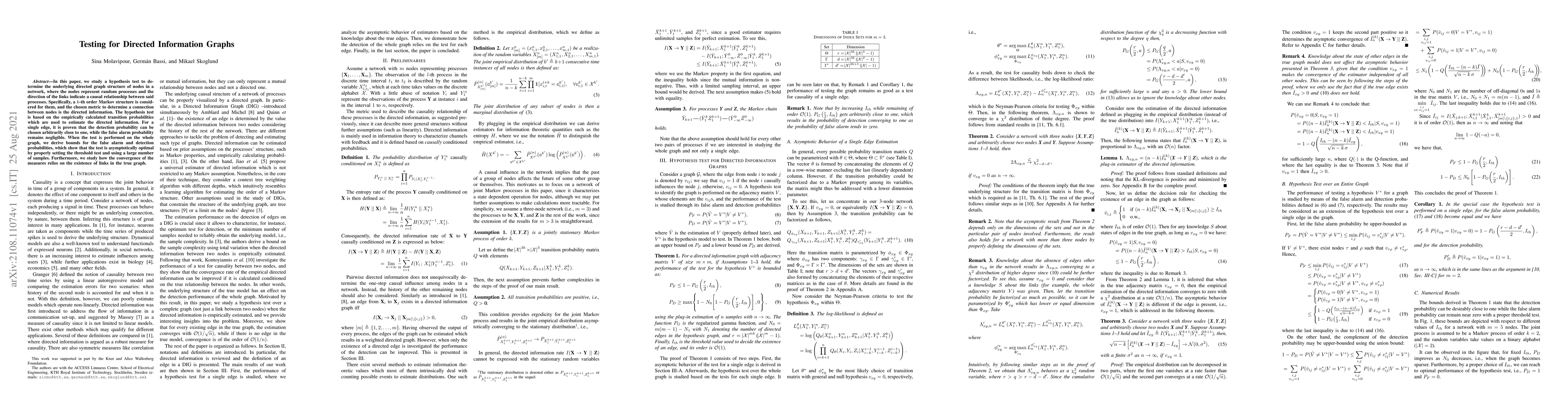 In this paper, we study a hypothesis test to determine the underlying directed graph structure of nodes in a network, where the nodes represent random processes and the direction of the links indicate a causal relationship between said processes. Specifically, a k-th order Markov structure is considered for them, and the chosen metric to determine a connection between nodes is the directed information. The hypothesis test is based on the empirically calculated transition probabilities which are used to estimate the directed information. For a single edge, it is proven that the detection probability can be chosen arbitrarily close to one, while the false alarm probability remains negligible. When the test is performed on the whole graph, we derive bounds for the false alarm and detection probabilities, which show that the test is asymptotically optimal by properly setting the threshold test and using a large number of samples. Furthermore, we study how the convergence of the measures relies on the existence of links in the true graph.