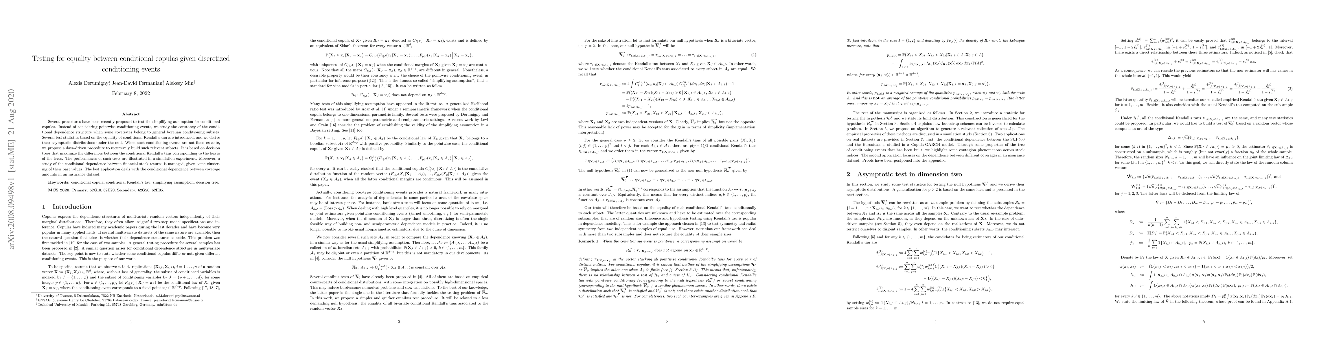 Several procedures have been recently proposed to test the simplifying assumption for conditional copulas. Instead of considering pointwise conditioning events, we study the constancy of the conditional dependence structure when some covariates belong to general borelian conditioning subsets. Several test statistics based on the equality of conditional Kendall's tau are introduced, and we derive their asymptotic distributions under the null. When such conditioning events are not fixed ex ante, we propose a data-driven procedure to recursively build such relevant subsets. It is based on decision trees that maximize the differences between the conditional Kendall's taus corresponding to the leaves of the trees. The performances of such tests are illustrated in a simulation experiment. Moreover, a study of the conditional dependence between financial stock returns is managed, given some clustering of their past values. The last application deals with the conditional dependence between coverage amounts in an insurance dataset.
