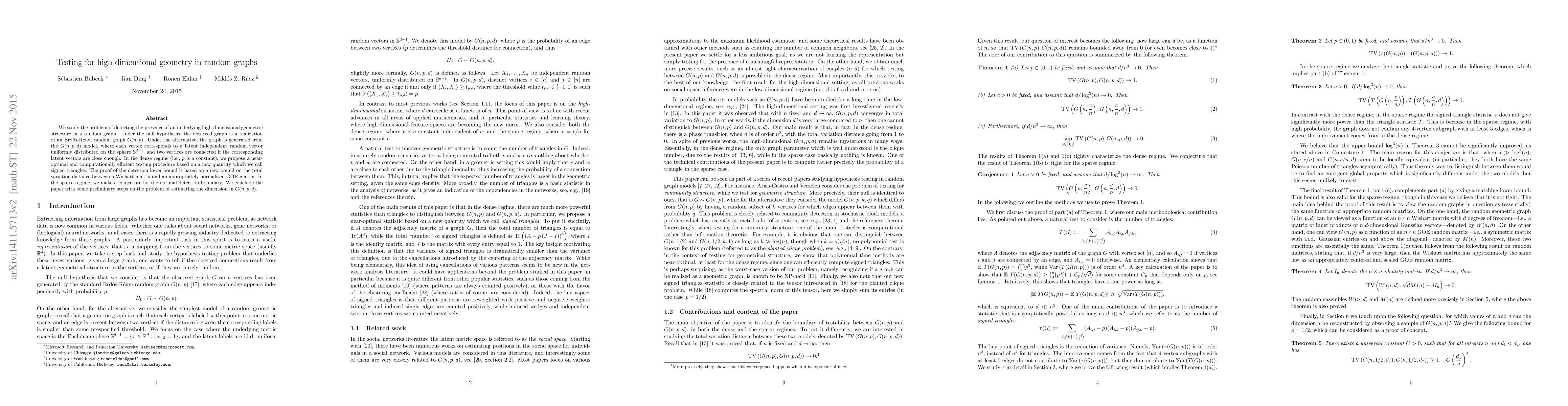 We study the problem of detecting the presence of an underlying high-dimensional geometric structure in a random graph. Under the null hypothesis, the observed graph is a realization of an Erd\H{o}s-R\'enyi random graph $G(n,p)$. Under the alternative, the graph is generated from the $G(n,p,d)$ model, where each vertex corresponds to a latent independent random vector uniformly distributed on the sphere $\mathbb{S}^{d-1}$, and two vertices are connected if the corresponding latent vectors are close enough. In the dense regime (i.e., $p$ is a constant), we propose a near-optimal and computationally efficient testing procedure based on a new quantity which we call signed triangles. The proof of the detection lower bound is based on a new bound on the total variation distance between a Wishart matrix and an appropriately normalized GOE matrix. In the sparse regime, we make a conjecture for the optimal detection boundary. We conclude the paper with some preliminary steps on the problem of estimating the dimension in $G(n,p,d)$.