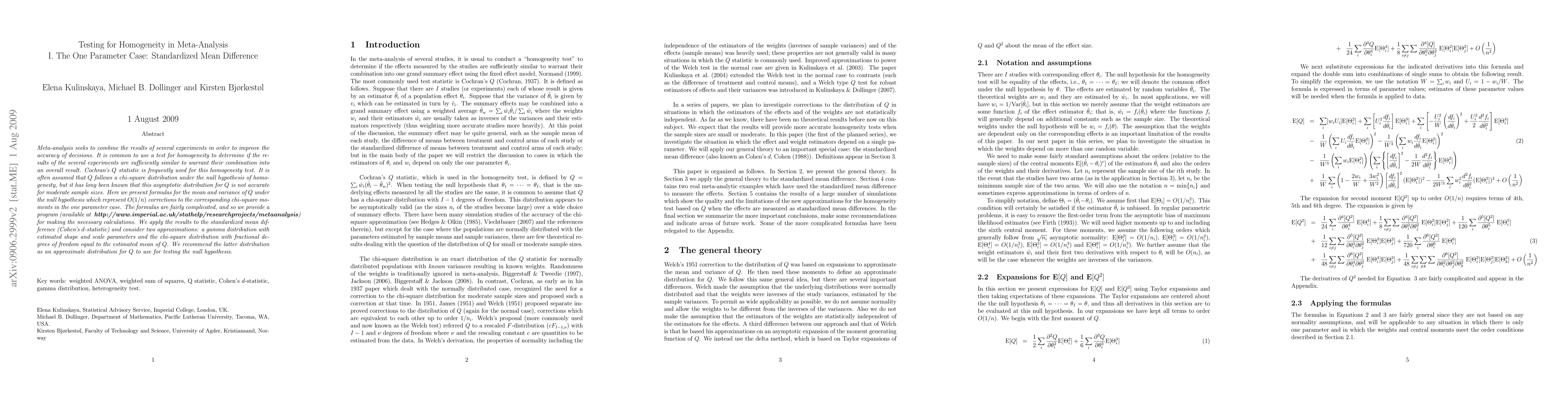 Meta-analysis seeks to combine the results of several experiments in order to improve the accuracy of decisions. It is common to use a test for homogeneity to determine if the results of the several experiments are sufficiently similar to warrant their combination into an overall result. Cochran's Q statistic is frequently used for this homogeneity test. It is often assumed that Q follows a chi-square distribution under the null hypothesis of homogeneity, but it has long been known that this asymptotic distribution for Q is not accurate for moderate sample sizes. Here we present formulas for the mean and variance of Q under the null hypothesis which represent O(1/n) corrections to the corresponding chi-square moments in the one parameter case. The formulas are fairly complicated, and so we provide a program (available at http://www.imperial.ac.uk/stathelp/researchprojects/metaanalysis) for making the necessary calculations. We apply the results to the standardized mean difference (Cohen's d-statistic) and consider two approximations: a gamma distribution with estimated shape and scale parameters and the chi-square distribution with fractional degrees of freedom equal to the estimated mean of Q. We recommend the latter distribution as an approximate distribution for Q to use for testing the null hypothesis.