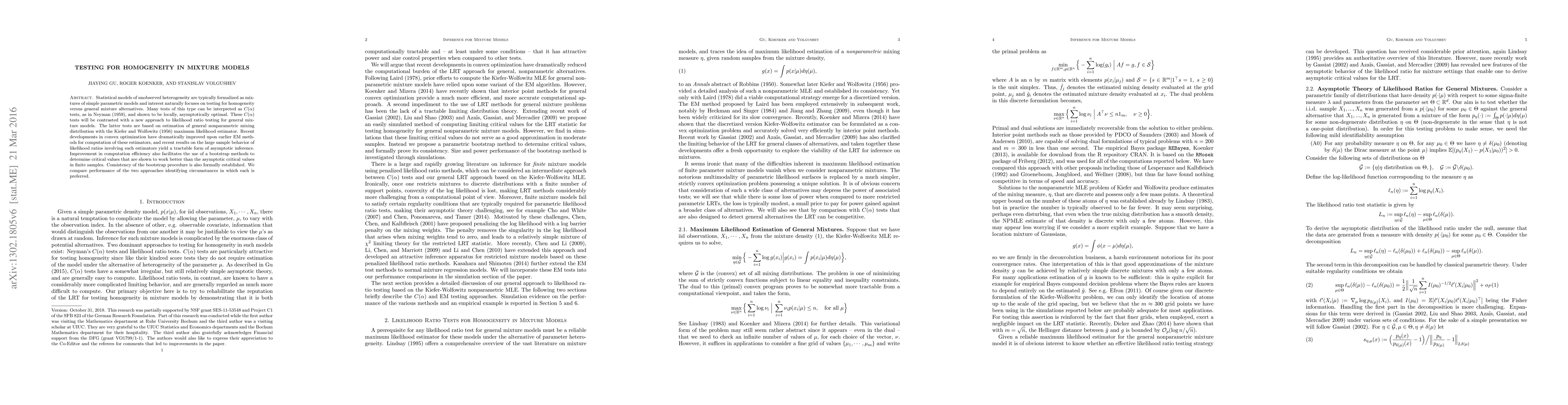 Statistical models of unobserved heterogeneity are typically formalized as mixtures of simple parametric models and interest naturally focuses on testing for homogeneity versus general mixture alternatives. Many tests of this type can be interpreted as $C(\alpha)$ tests, as in Neyman (1959), and shown to be locally, asymptotically optimal. These $C(\alpha)$ tests will be contrasted with a new approach to likelihood ratio testing for general mixture models. The latter tests are based on estimation of general nonparametric mixing distribution with the Kiefer and Wolfowitz (1956) maximum likelihood estimator. Recent developments in convex optimization have dramatically improved upon earlier EM methods for computation of these estimators, and recent results on the large sample behavior of likelihood ratios involving such estimators yield a tractable form of asymptotic inference. Improvement in computation efficiency also facilitates the use of a bootstrap methods to determine critical values that are shown to work better than the asymptotic critical values in finite samples. Consistency of the bootstrap procedure is also formally established. We compare performance of the two approaches identifying circumstances in which each is preferred.