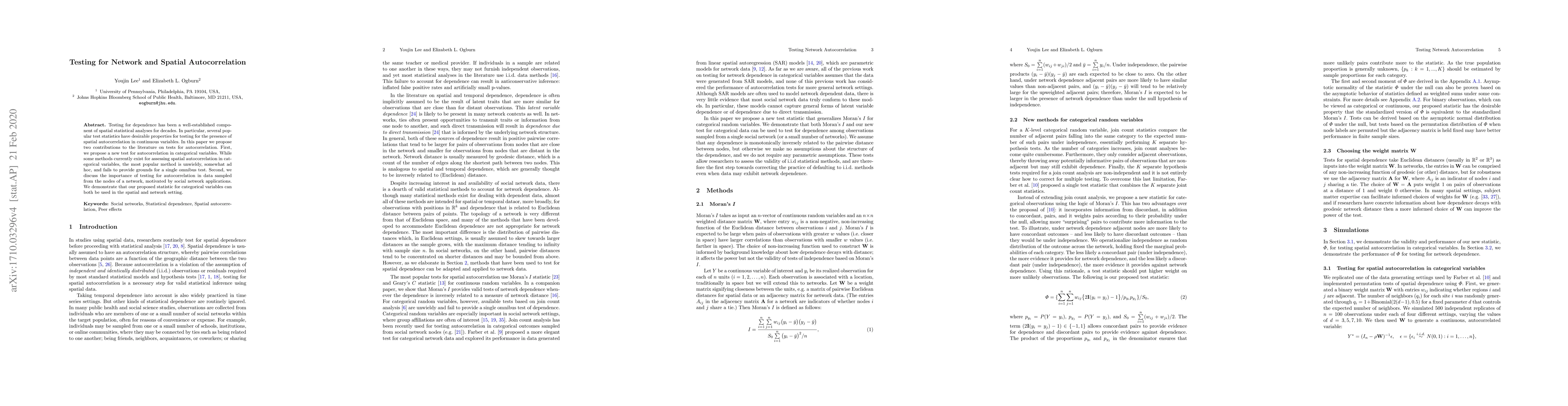 Testing for dependence has been a well-established component of spatial statistical analyses for decades. In particular, several popular test statistics have desirable properties for testing for the presence of spatial autocorrelation in continuous variables. In this paper we propose two contributions to the literature on tests for autocorrelation. First, we propose a new test for autocorrelation in categorical variables. While some methods currently exist for assessing spatial autocorrelation in categorical variables, the most popular method is unwieldy, somewhat ad hoc, and fails to provide grounds for a single omnibus test. Second, we discuss the importance of testing for autocorrelation in data sampled from the nodes of a network, motivated by social network applications. We demonstrate that our proposed statistic for categorical variables can both be used in the spatial and network setting.