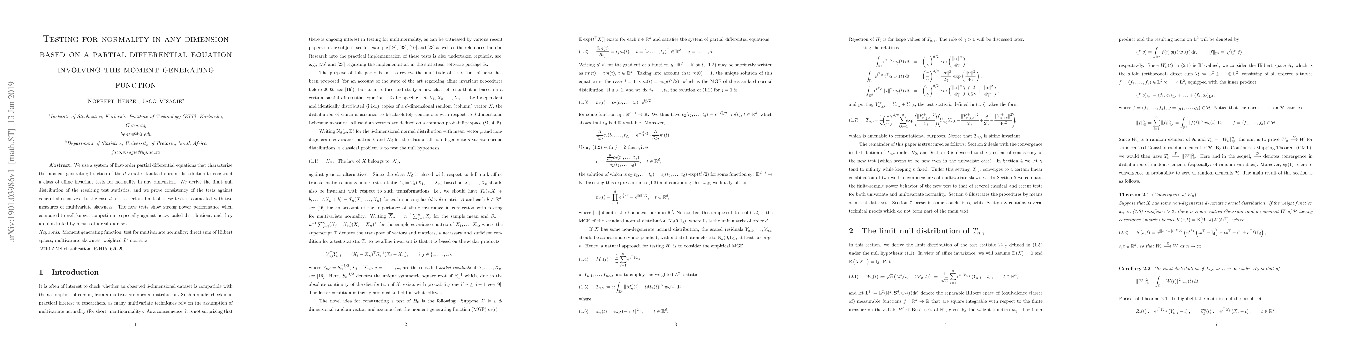 We use a system of first-order partial differential equations that characterize the moment generating function of the $d$-variate standard normal distribution to construct a class of affine invariant tests for normality in any dimension. We derive the limit null distribution of the resulting test statistics, and we prove consistency of the tests against general alternatives. In the case $d > 1$, a certain limit of these tests is connected with two measures of multivariate skewness. The new tests show strong power performance when compared to well-known competitors, especially against heavy-tailed distributions, and they are illustrated by means of a real data set.