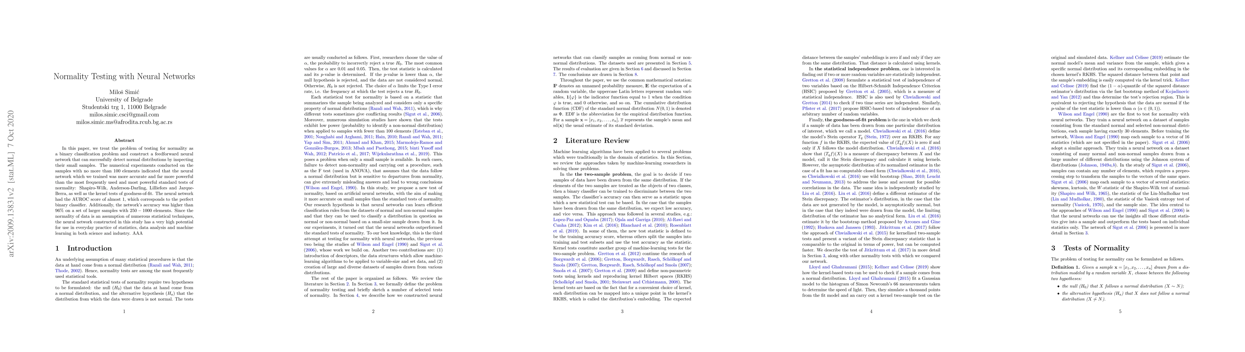 In this paper, we treat the problem of testing for normality as a binary classification problem and construct a feedforward neural network that can successfully detect normal distributions by inspecting small samples from them. The numerical experiments conducted on small samples with no more than 100 elements indicated that the neural network which we trained was more accurate and far more powerful than the most frequently used and most powerful standard tests of normality: Shapiro-Wilk, Anderson-Darling, Lilliefors and Jarque-Berra, as well as the kernel tests of goodness-of-fit. The neural network had the AUROC score of almost 1, which corresponds to the perfect binary classifier. Additionally, the network's accuracy was higher than 96% on a set of larger samples with 250-1000 elements. Since the normality of data is an assumption of numerous techniques for analysis and inference, the neural network constructed in this study has a very high potential for use in everyday practice of statistics, data analysis and machine learning in both science and industry.